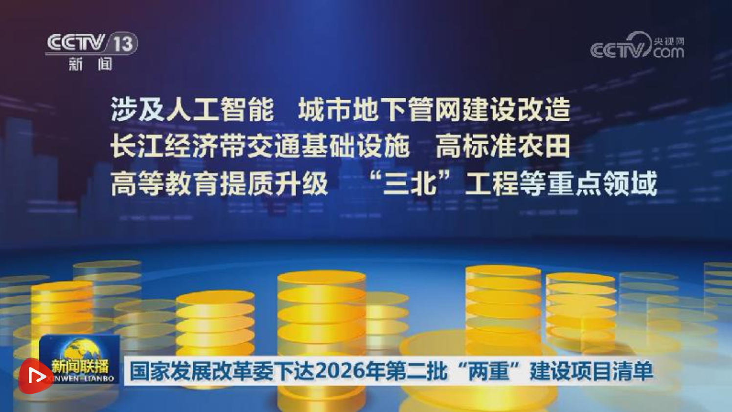 央視網消息(新聞聯播):近日,國家發展改革委會同有關部門組織下達了2026年第二批“兩重”建設項目清單,共安排超長期特別國債資金2168億元支持336個重大項目,涉及人工智能、城市地下管網建設改造、長江經濟帶交通基礎設施、高標準農田、高等教育提質升級、“三北”工程等重點領域。加上此前已下達的3897億元,今年累計安排“兩重”建設資金6065億元,占全年8000億元的76%,下達進度明顯快于去年。與此同時,進一步完善優化投融資等機制,加快實施“軟建設”措施,強化中央投資資金監管,盡早形成更多實物工作量。
