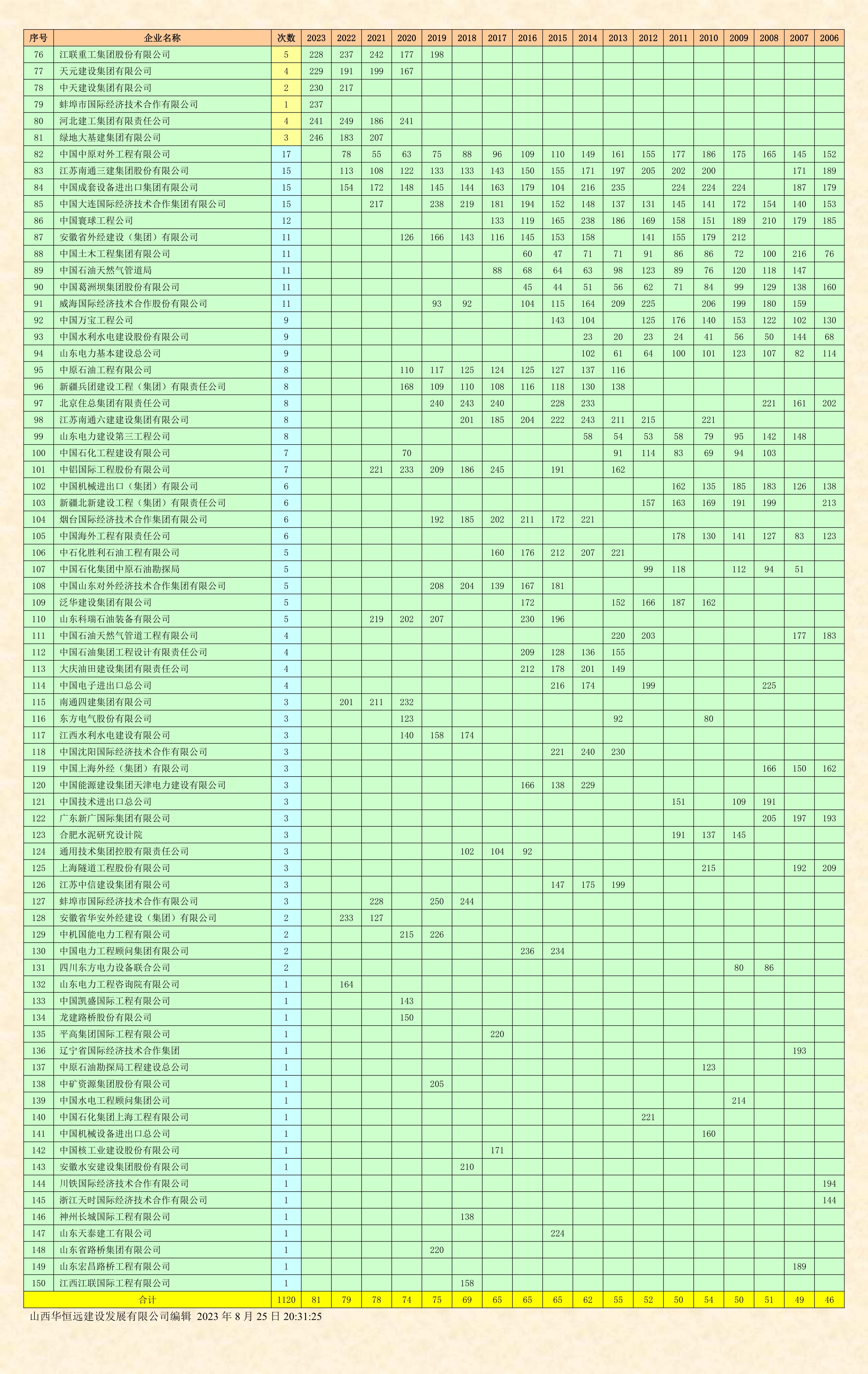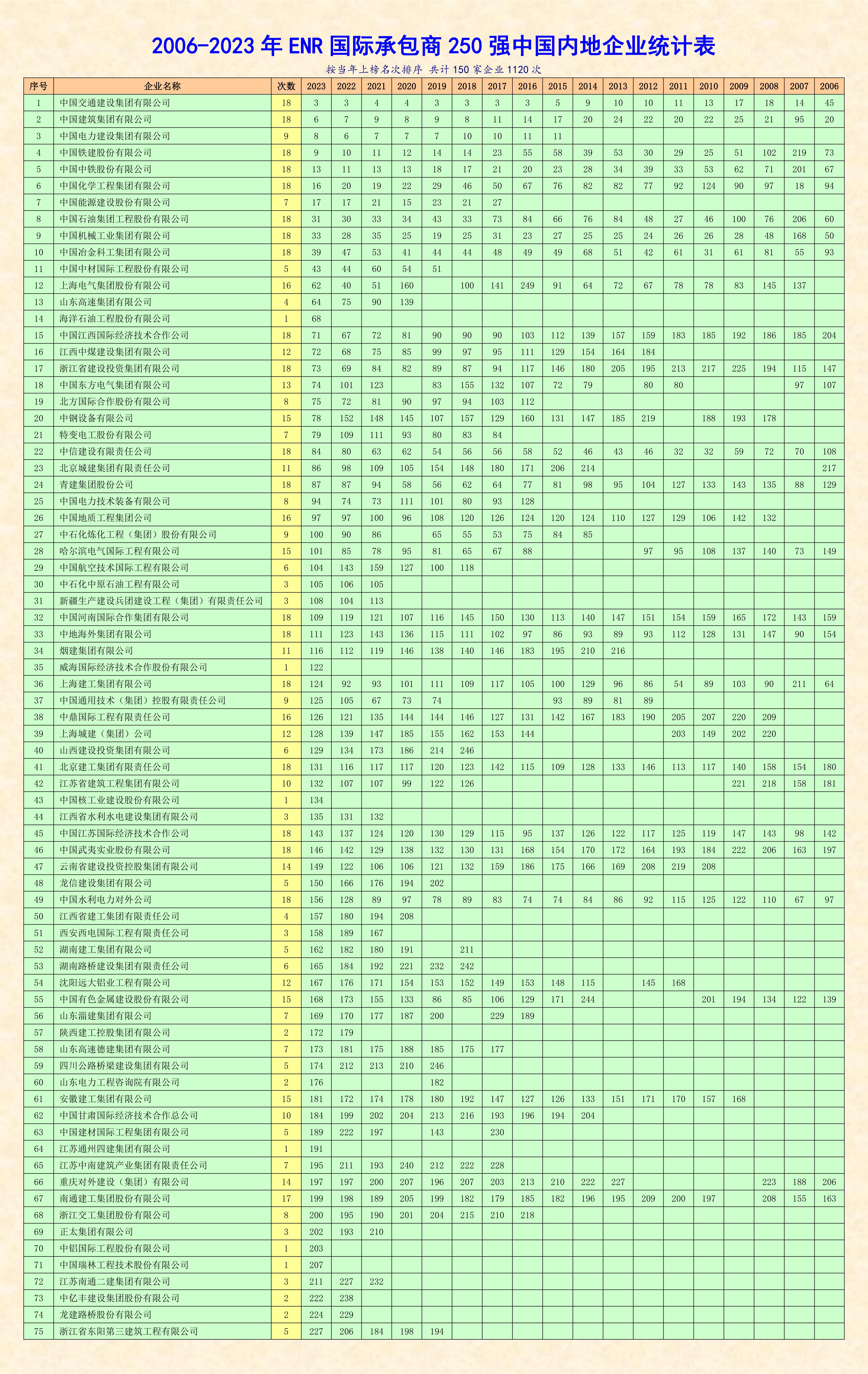 據悉,美國《工程新聞紀錄》(ENR)雜志是全球工程建設領域最權威的學術雜志,其每年發布的“全球承包商250強”和“國際承包商250強”榜單被譽為國際工程界的“晴雨表”,是建筑行業公認的、較為全面反映年度全球建筑市場發展狀況的權威排名。其中,全球榜單根據企業的整體營業額進行排名,反映了企業的整體營業能力。國際榜單根據企業海外業務營業額,即本國以外的國際市場完成的營業額進行排名,反映了企業在國際市場上的競爭力。