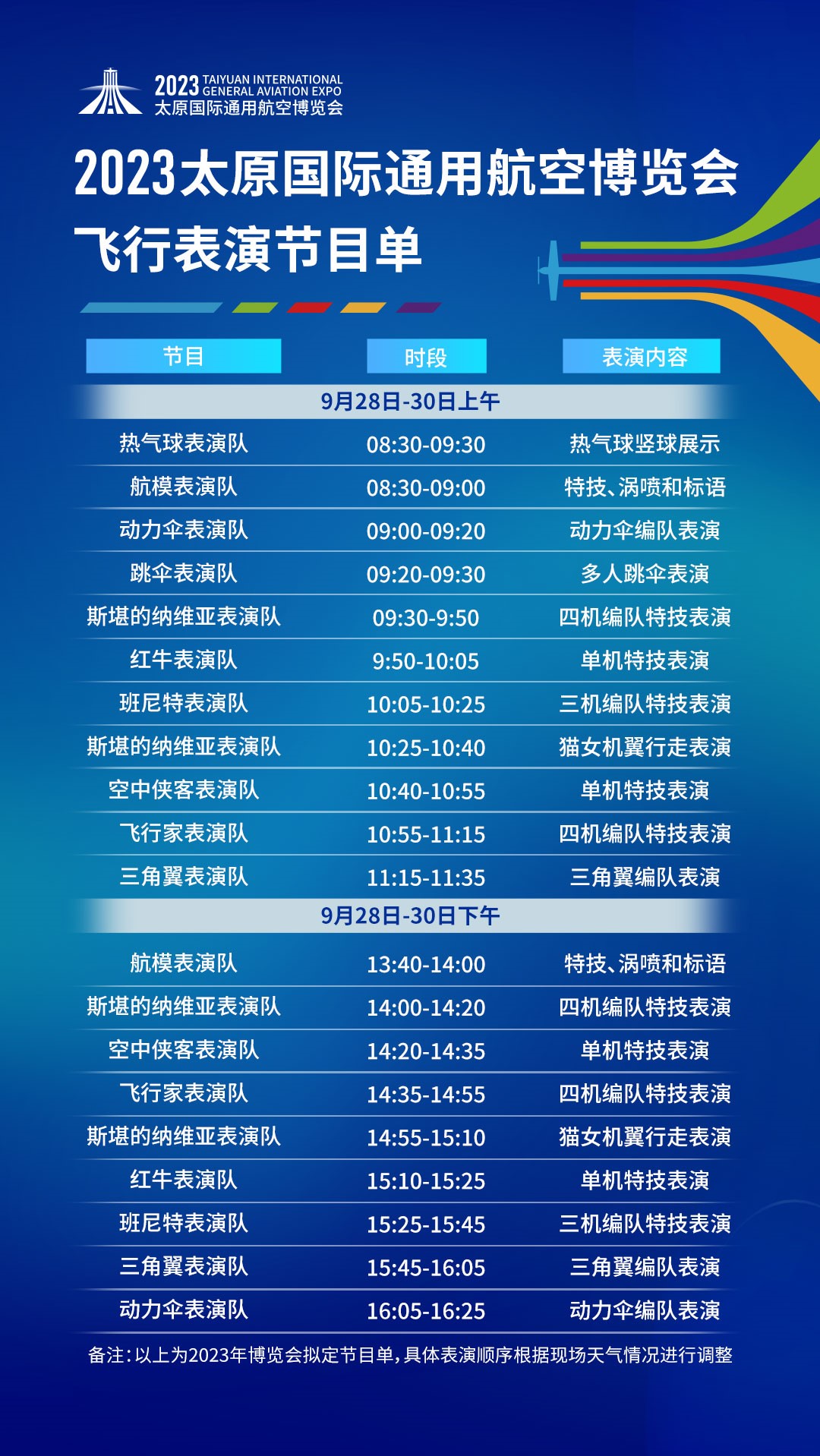 另外,動力懸掛滑翔機編隊表演、熱氣球表演、跳傘表演、動力傘編隊飛行等航空體育運動表演項目,也將為觀眾帶來絕妙的視聽感受。