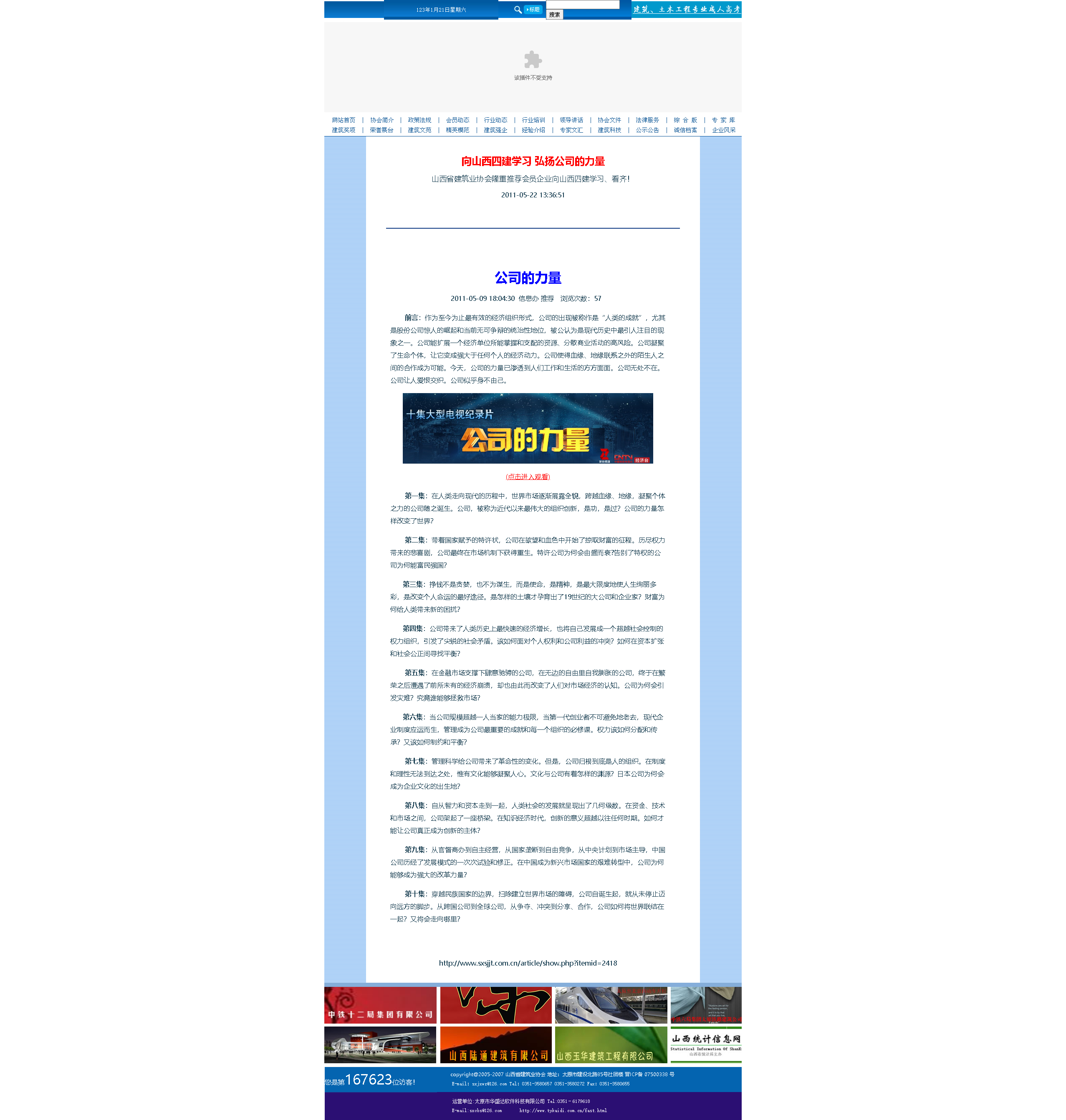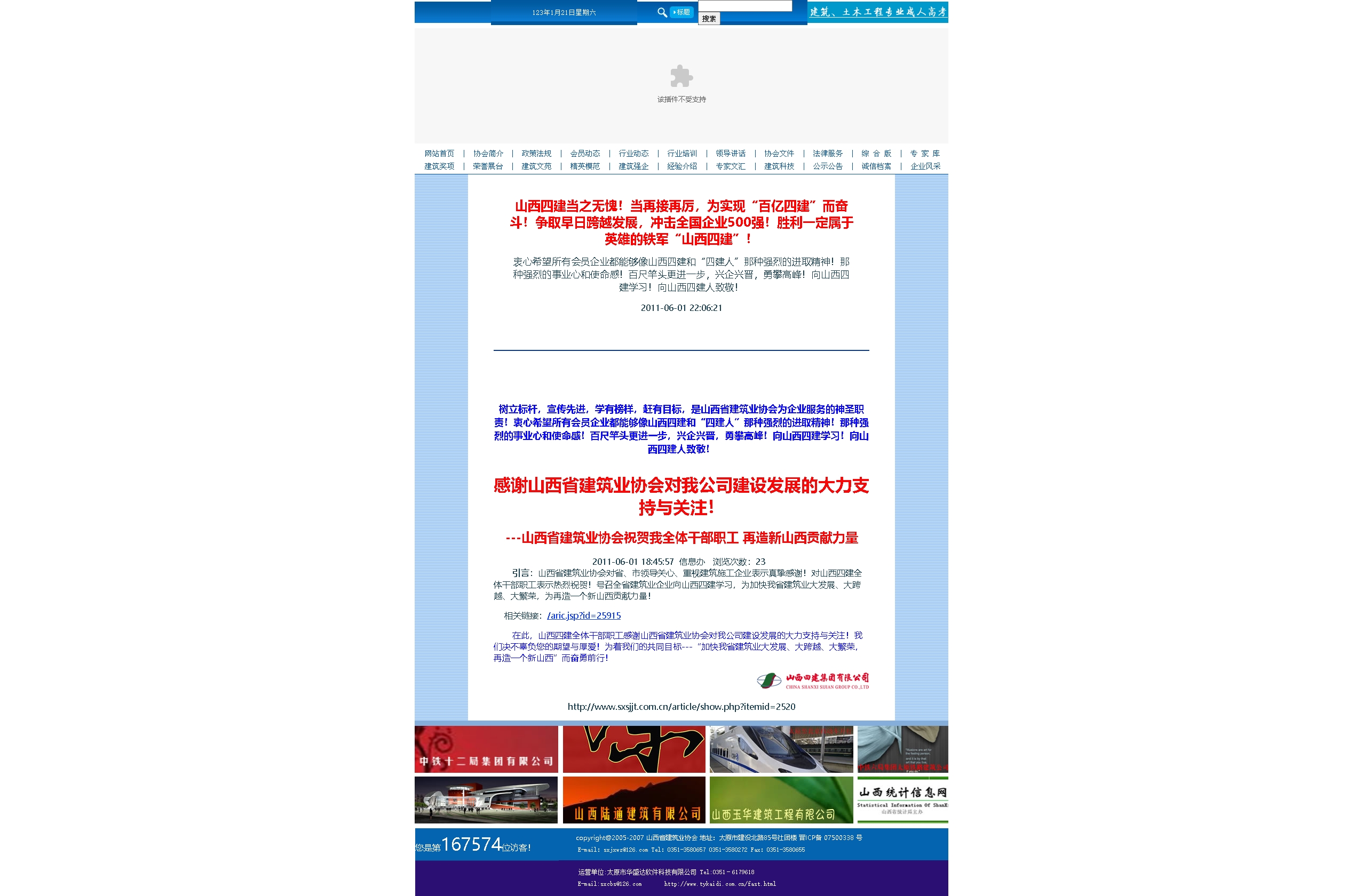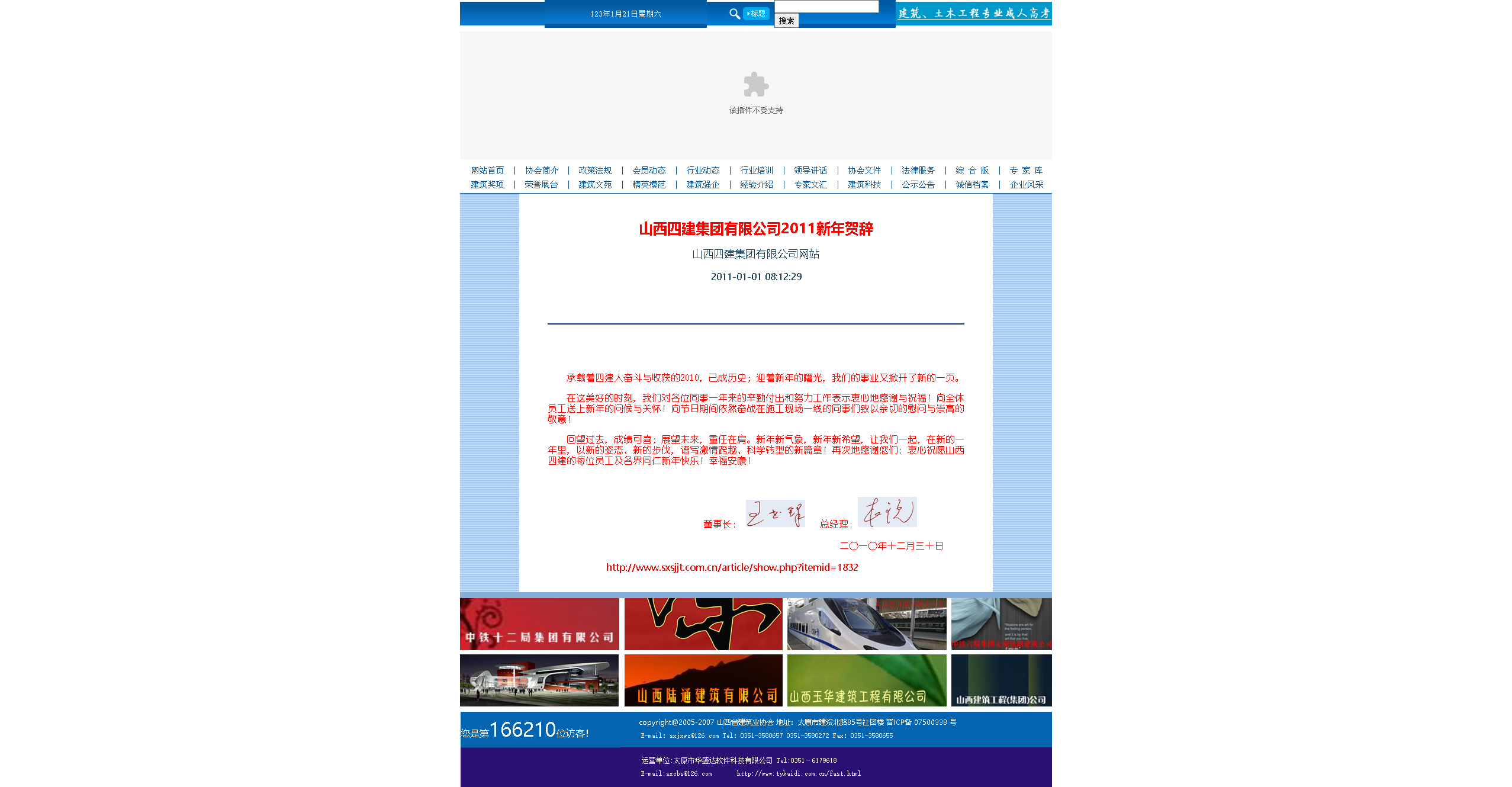 山西四建集團有限公司作為山西建筑業行業標桿,關注他們是我幾十年的習慣,一直把這個企業的靈魂文化看成是行業的風向標和榜樣。尤其特別關注他們每年的新春賀詞,我在建協負責網站時,多次表揚他們,鼓勵他們,支持他們!你進他們的網站看看,現在怎么樣,存在什么問題,如何解決?你有什么感悟,有什么高明的真知灼見呢?