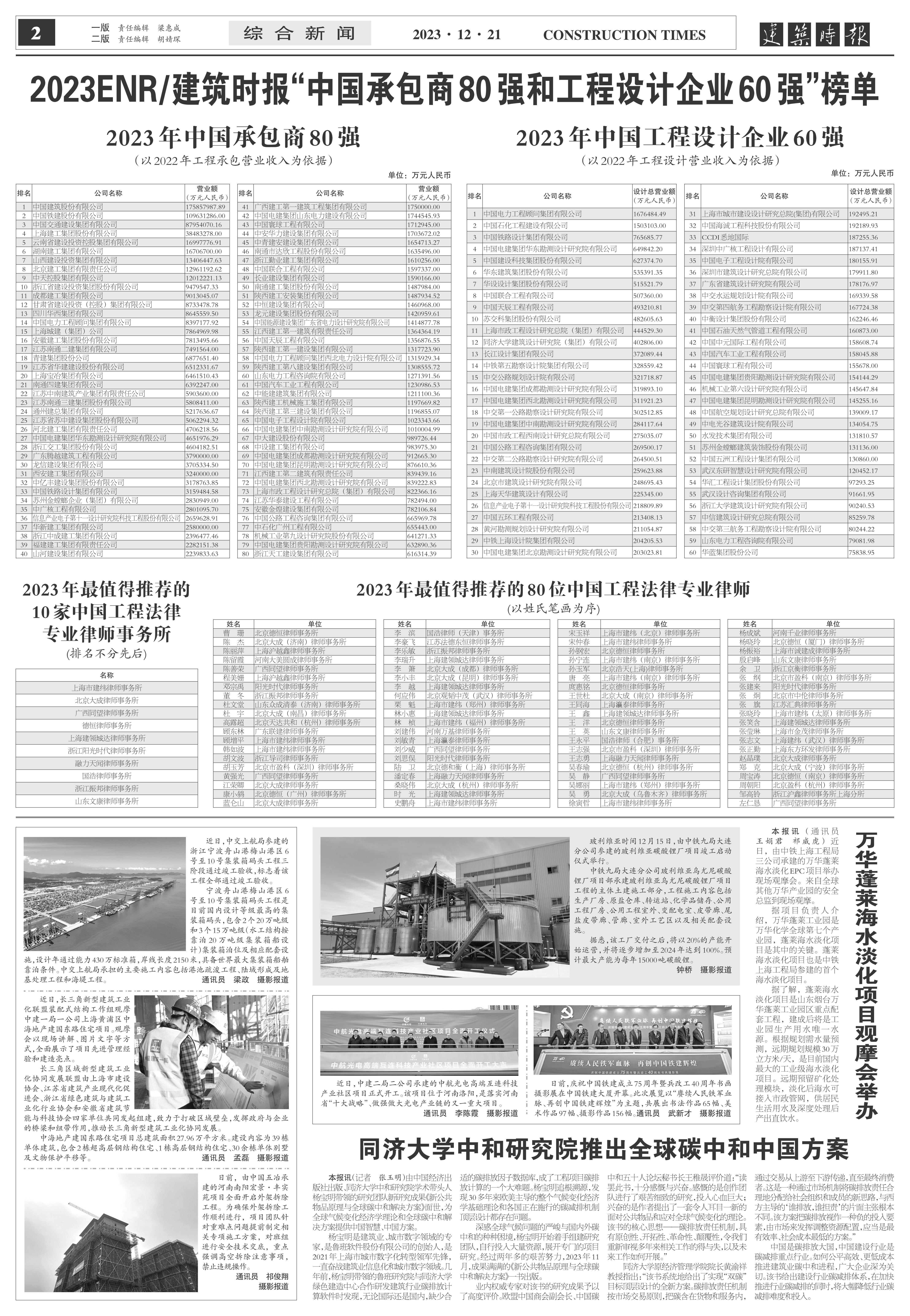近日,《建筑時報》和美國《工程新聞記錄》(ENR)共同發布2023ENR/建筑時報“中國承包商80強和工程設計企業60強”排名榜單。