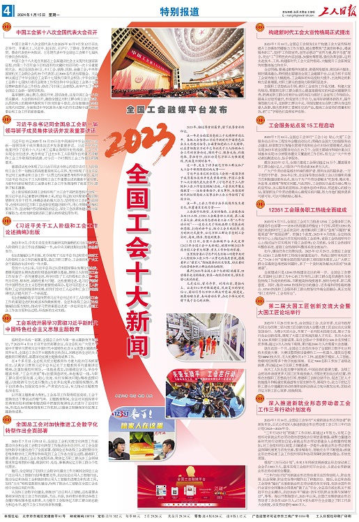 1月15日,全國工會融媒平臺正式發布《2023年全國工會十大新聞》,梳理回顧2023年度全國工會重大部署、重點工作和創新舉措。
