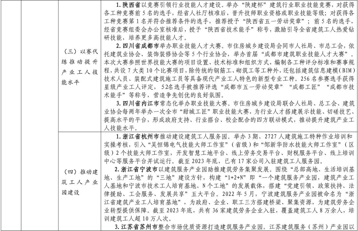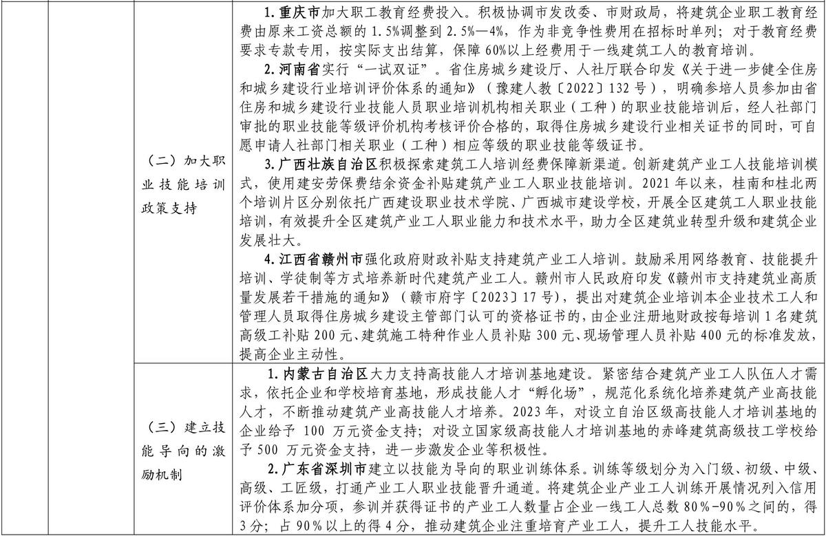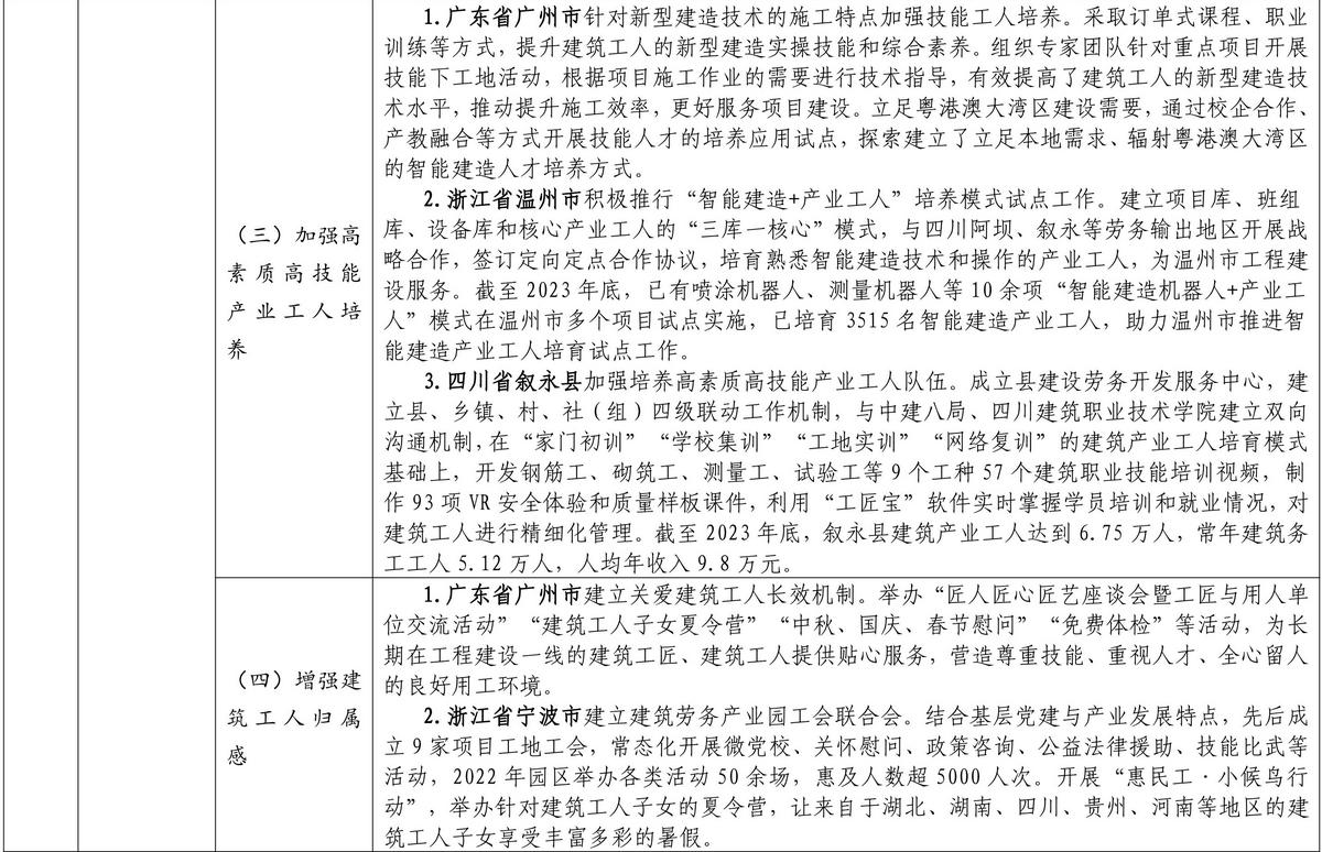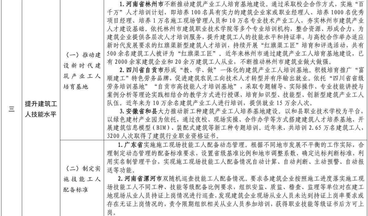 按照《住房和城鄉建設部等部門關于加快培育新時代建筑產業工人隊伍的指導意見》要求,各地圍繞推進農民工向新時代建筑產業工人轉型、完善建筑工人實名制管理、提升建筑工人技能水平、加強統籌協作和政策支持、保障建筑工人合法權益等方面,積極探索、大力推進新時代建筑產業工人隊伍建設,取得了積極成效。近日,住房和城鄉建設部印發培育新時代建筑產業工人可復制經驗做法清單(第一批)。