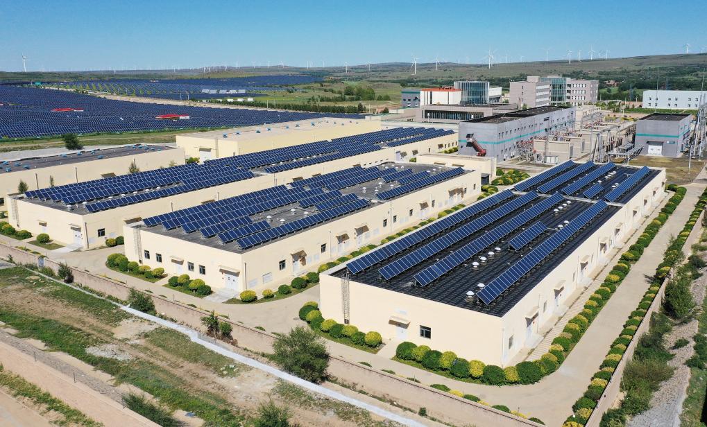 在河北張家口,國家風光儲輸示范工程內數排儲能廠房并列其中。(2023年8月18日攝,無人機照片)。新華社記者李賀 攝