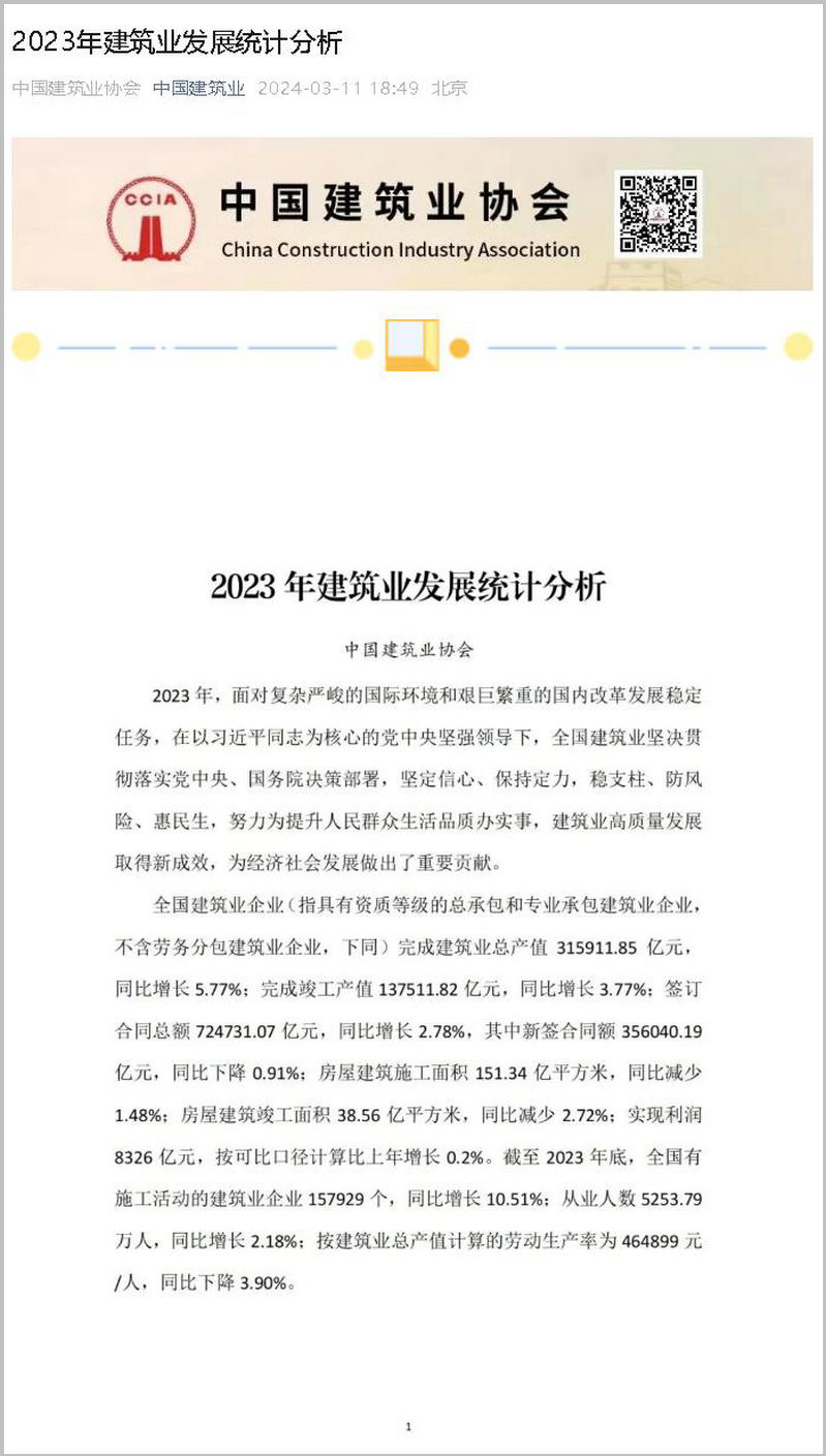 近日,中國建筑業(yè)協(xié)會發(fā)布了《2023年建筑業(yè)發(fā)展統(tǒng)計分析》。 截至2023年底,全國建筑業(yè)企業(yè) (指具有資質(zhì)等級的總承包和專業(yè)承包建筑業(yè)企業(yè),不含勞務分包建筑業(yè)企業(yè),下同) 相關數(shù)據(jù)如下: