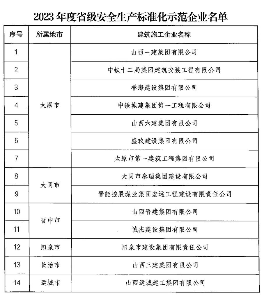 根據《山西省住房和城鄉建設廳建筑施工安全生產標準化創建和考評實施細則》,經企業自主申報,省廳組織專家資料審查、現場核查,評定山西一建集團有限公司等14個企業為2023年度“省級安全生產標準化示范企業”,評定濱河東路南延二期工程施工一標段等38個項目為2023年度第二批“省級安全生產標準化示范項目”,且經公示無異議,現將名單予以公布。