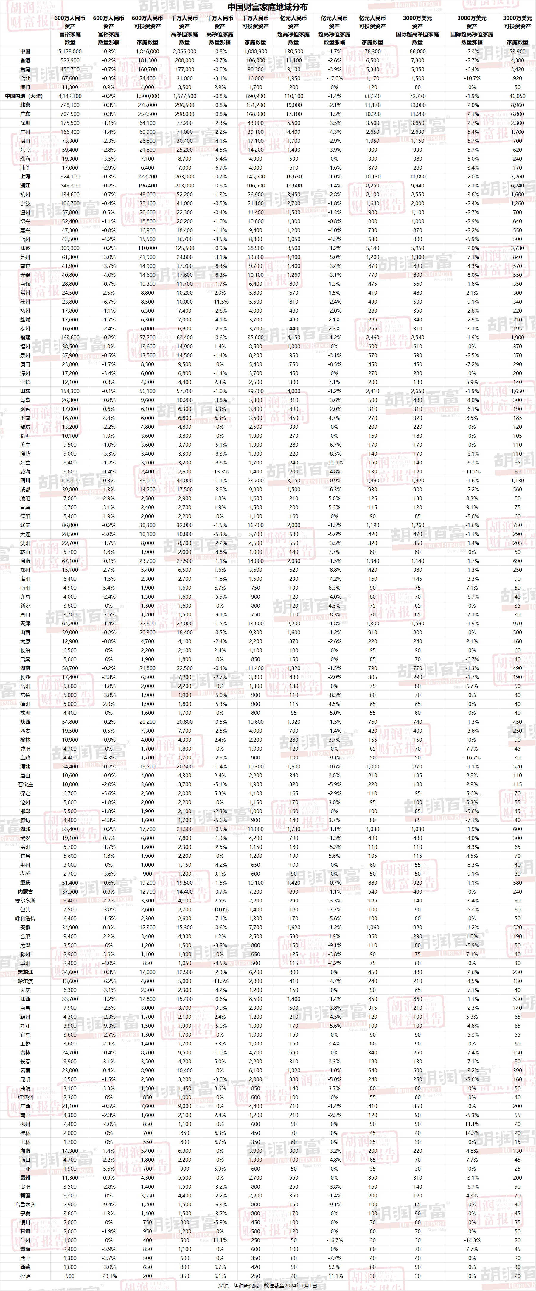 截至2024年1月1日,中國富裕家庭(資產600萬以上)數量微降至512.8萬戶,同比減少0.3%,即減少了1.4萬戶,其中,擁有600萬可投資資產的家庭為184.6萬戶。高凈值家庭(資產千萬以上)數量為206.6萬戶,同比減少0.8%,減少了1.7萬戶,其中擁有千萬可投資資產的家庭為108.9萬戶。超高凈值家庭(資產億元以上)數量為13萬戶,同比減少1.7%,減少了2,200戶,其中擁有億元可投資資產的家庭為7.8萬戶。國際超高凈值家庭(資產3000萬美元以上)數量為8.6萬戶,同比減少2.3%,減少了2,000戶,其中擁有3000萬美元可投資資產的家庭為5.4萬戶。