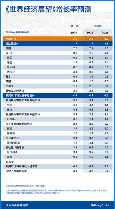2025年和2026年,全球經濟增速預計均為3.3%,低于3.7%的歷史平均水平(2000年至2019年)。2025年的預測值與2024年10月《世界經濟展望》的預測基本持平,這主要是因為美國增速的上調抵消了其他主要經濟體增速的下調。全球的總體通脹率預計將在2025年下降至4.2%,到2026年下降至3.5%。與新興市場和發展中經濟體相比,發達經濟體的總體通脹將更早回歸至目標水平。