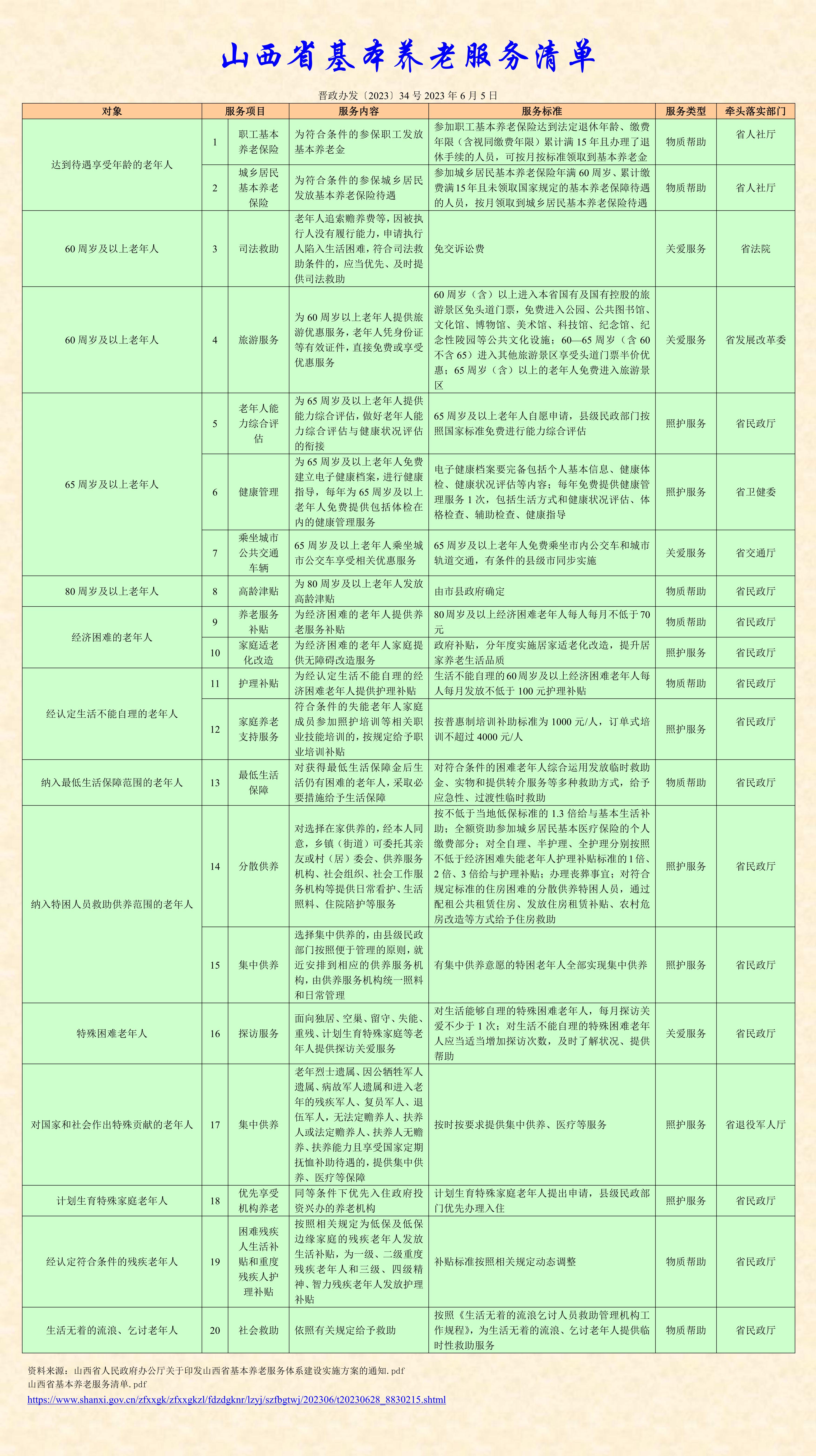 國家和山西省基本養老服務清單
