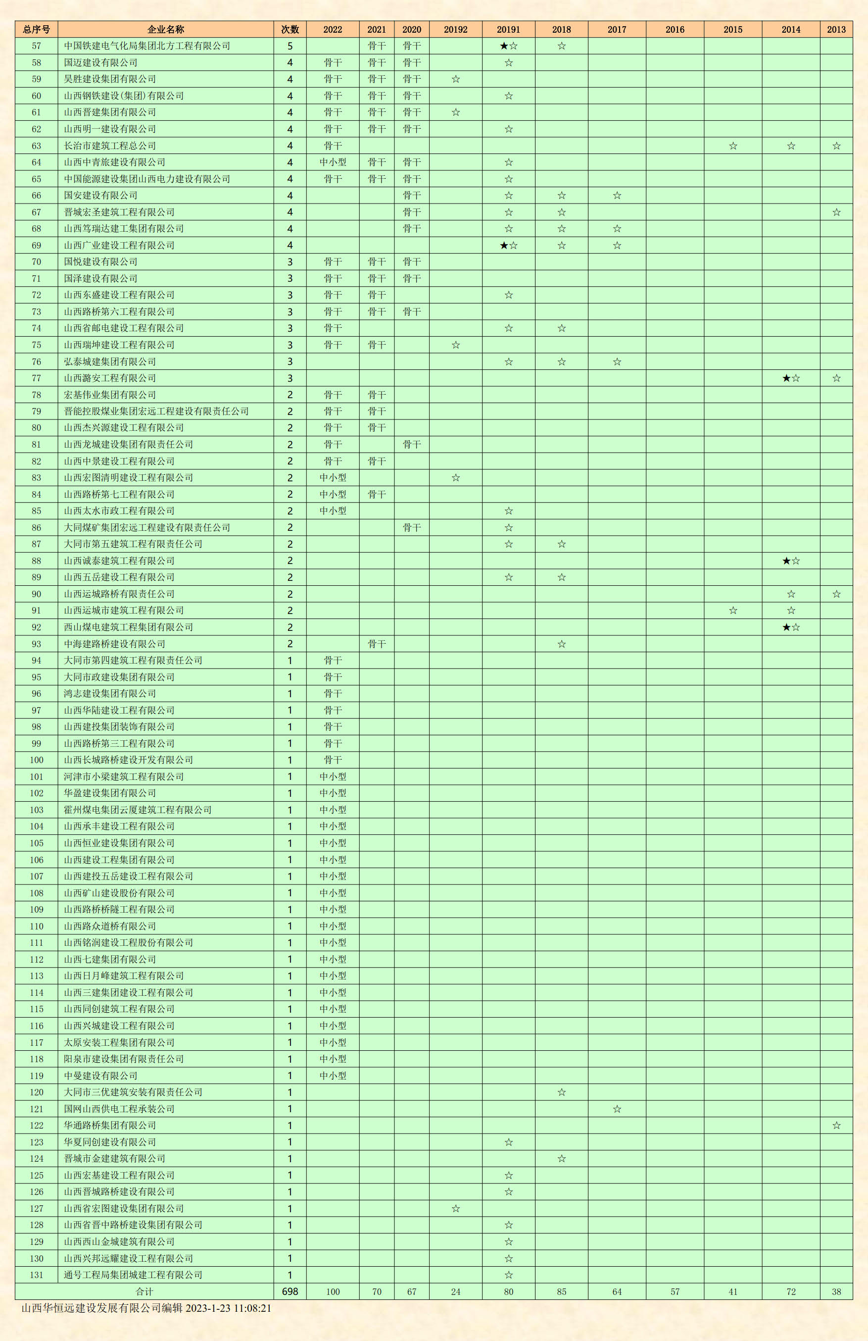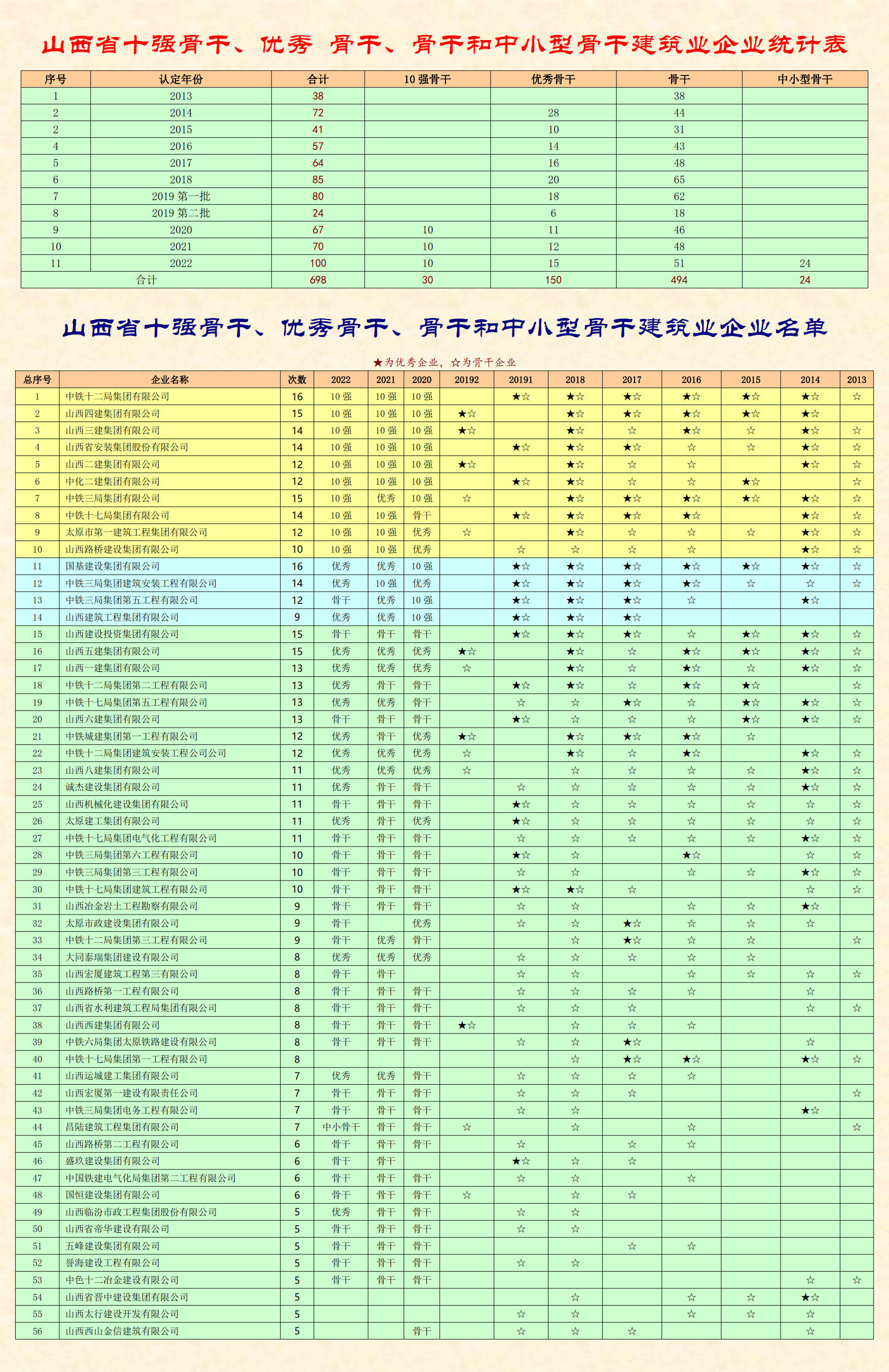歷年山西省骨干、優秀骨干 和10強骨干建筑業企業名單及統計表
