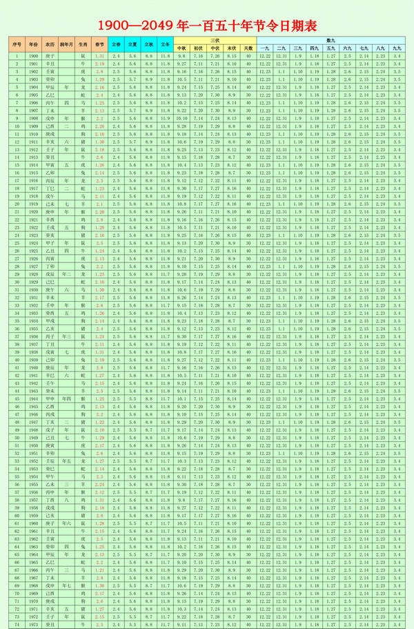 1900-2049二十四節(jié)氣及公歷農(nóng)歷佛歷和三伏數(shù)九中秋春節(jié)日期表