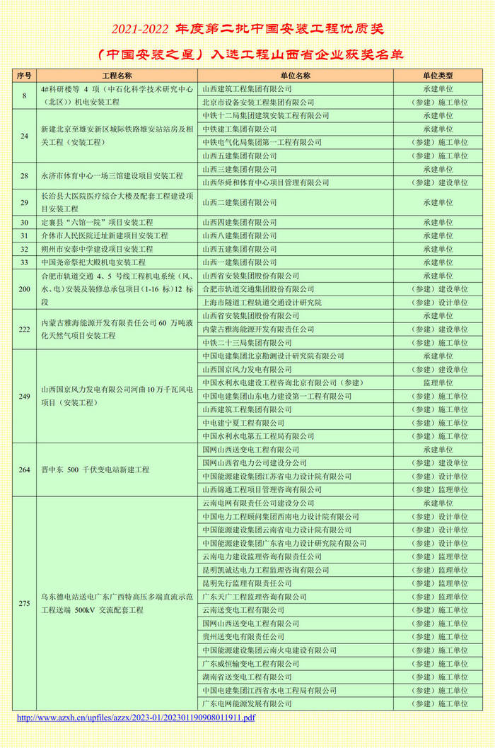 2021-2022 年度第二批中國安裝工程優質獎 (中國安裝之星)入選工程名單