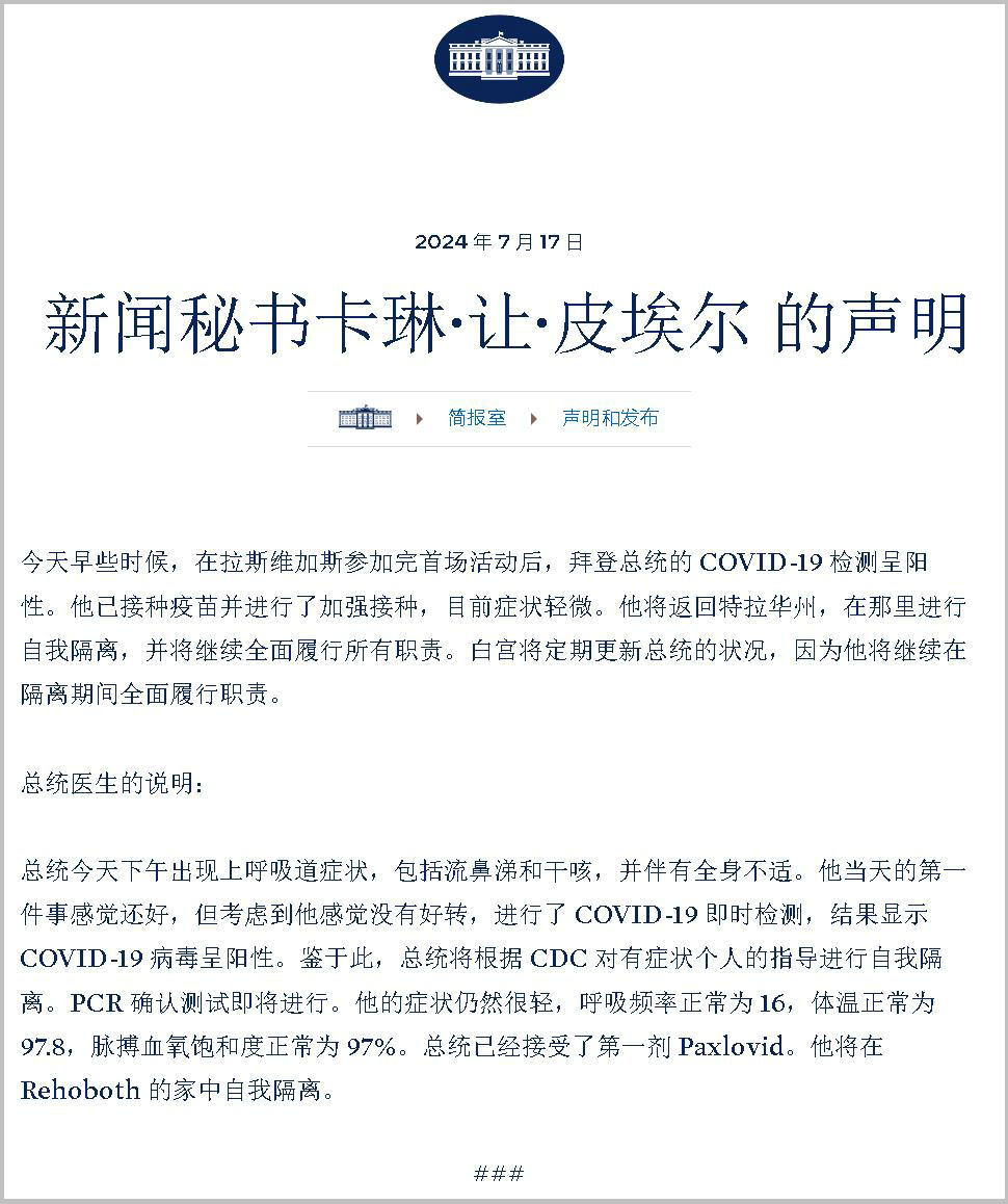 新華社美國(guó)密爾沃基7月17日電(記者熊茂伶)白宮17日發(fā)表聲明說,美國(guó)總統(tǒng)拜登當(dāng)天新冠病毒檢測(cè)呈陽(yáng)性,有輕微癥狀。