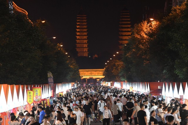 2024年7月16日,山西太原,雙塔寺前人山人海。豐富多彩的夜間主題活動,滿足人們舒適納涼的需求,進一步催熱“夏日夜經濟”。視覺中國 資料圖