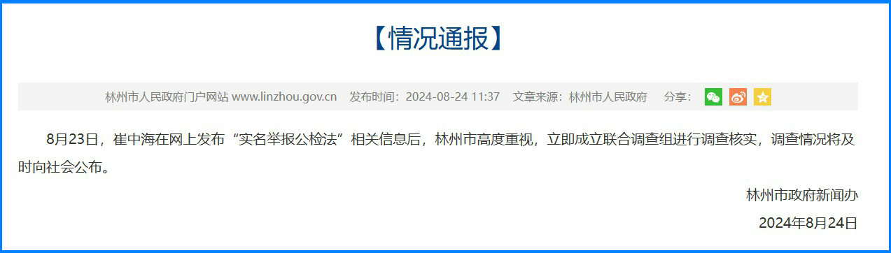 針對上述舉報,林州市政府新聞辦24日發布情況通報,稱8月23日,崔中海在網上發布“實名舉報公檢法”相關信息后,林州市高度重視,立即成立聯合調查組進行調查核實,調查情況將及時向社會公布。