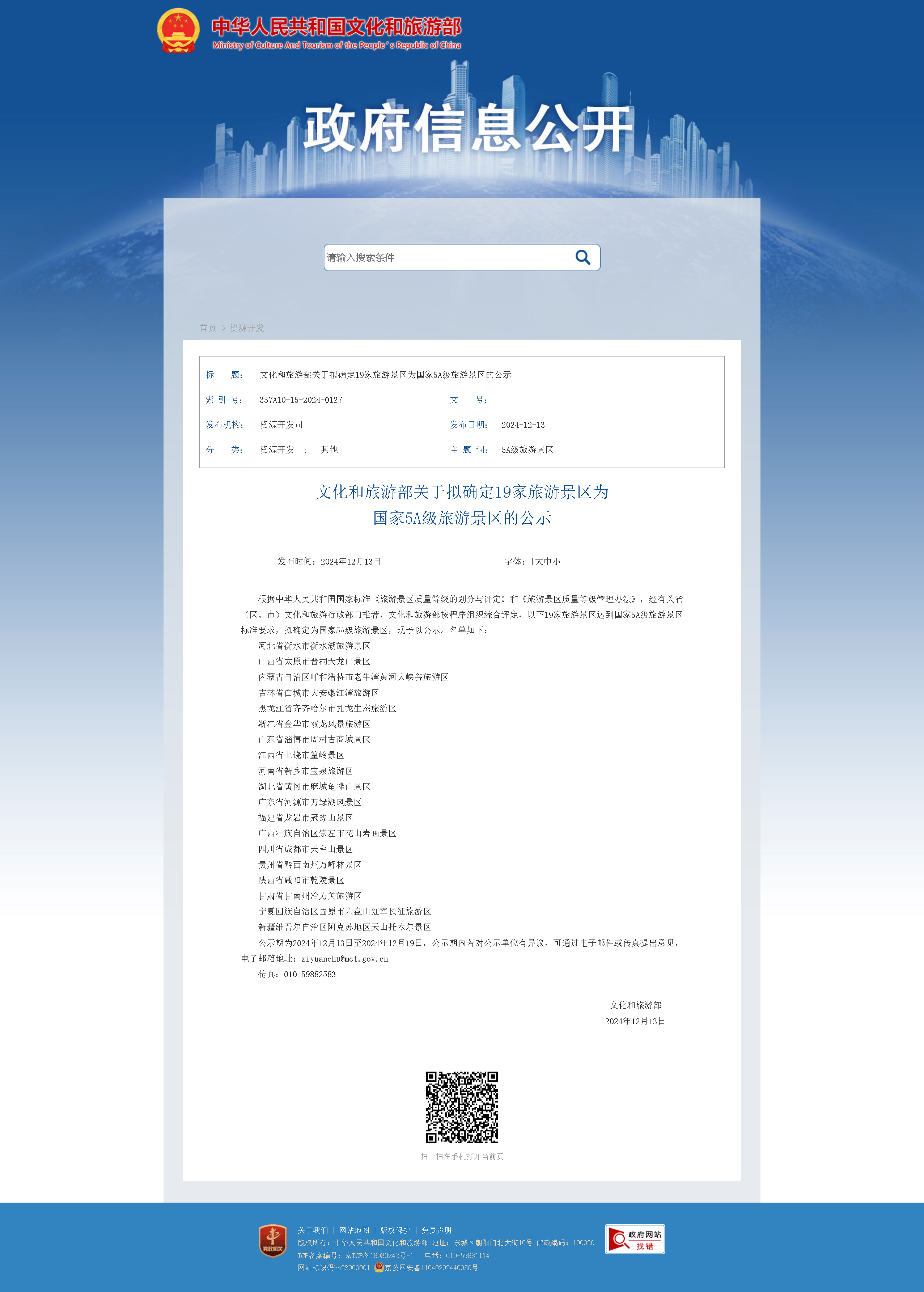 文旅部網(wǎng)站12月13日消息,文化和旅游部發(fā)布關(guān)于擬確定19家旅游景區(qū)為國(guó)家5A級(jí)旅游景區(qū)的公示: