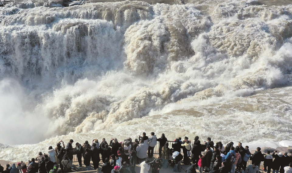 1月29日,游客在吉縣黃河壺口瀑布景區(qū)游覽觀瀑。新春佳節(jié),吉縣黃河壺口瀑布以其奔騰咆哮的雄姿和冰瀑彩虹的壯美景色,吸引了眾多游客