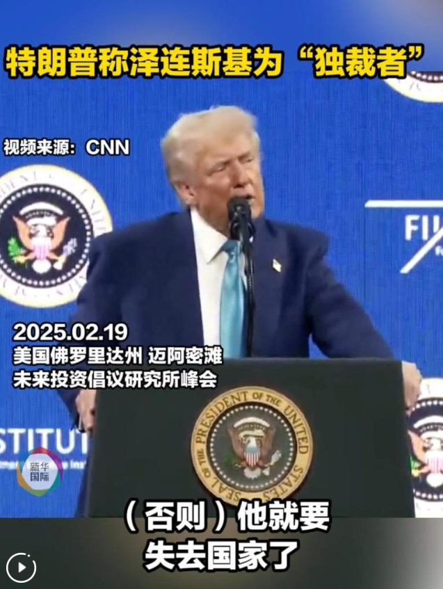 美國總統特朗普19日在佛羅里達州一場會議上說,烏克蘭總統澤連斯基是 “獨裁者”。他警告說,澤連斯基必須迅速采取行動以實現和平,否則將面臨失去國家的風險。