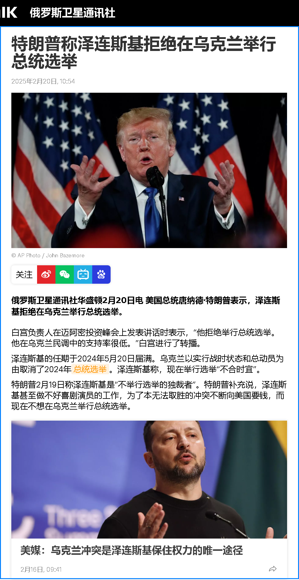 特朗普在文中多次指責澤連斯基,稱其是“一個不舉行選舉的獨裁者”“在烏克蘭民意調查中支持率很低”“唯一擅長的就是‘像拉小提琴一樣’把(美方)玩弄于股掌之上”。