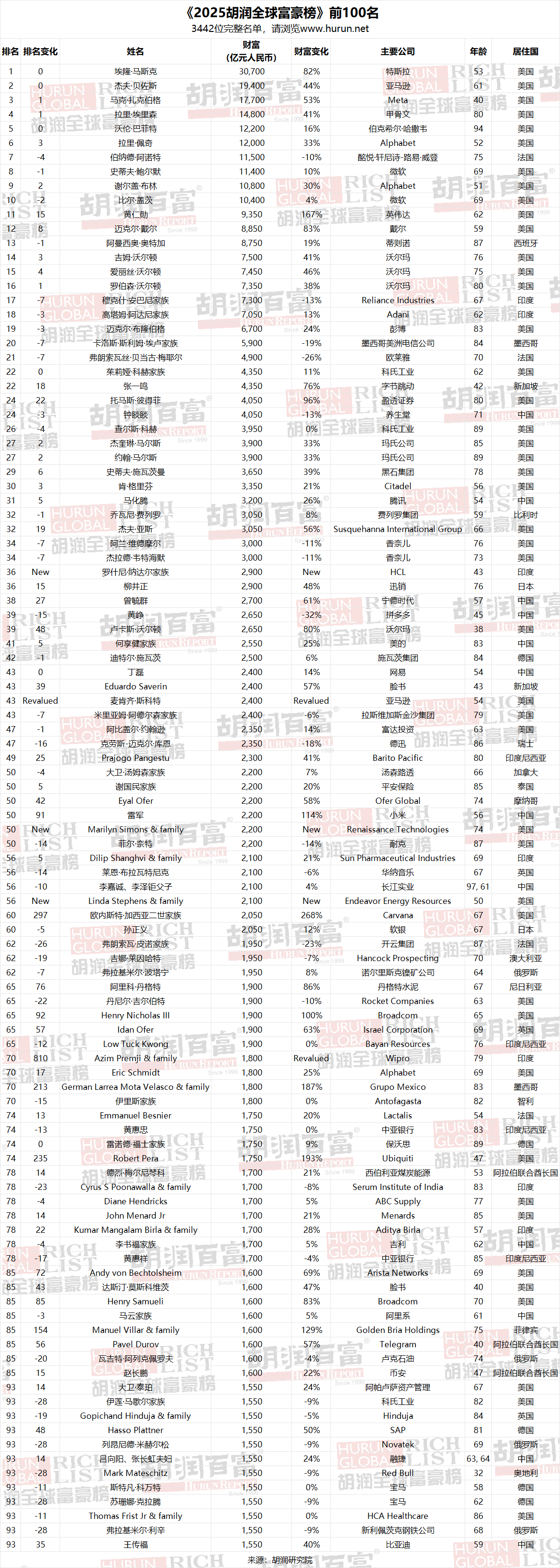 胡潤研究院今日發(fā)布《2025胡潤全球富豪榜》(Hurun Global Rich List 2025)。財富計算的截止日期為2025年1月15日。這是胡潤研究院連續(xù)第14年發(fā)布“全球富豪榜”。