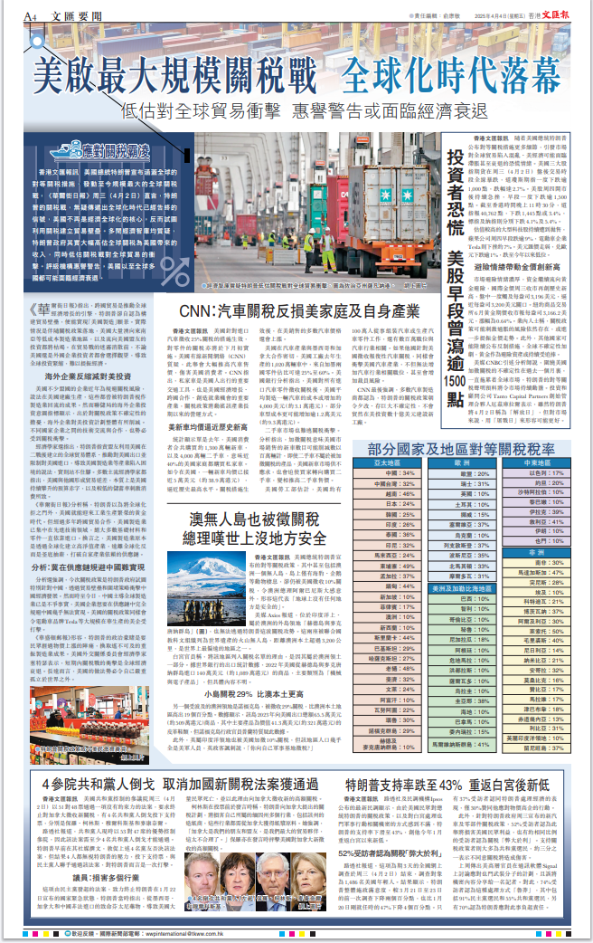 美國(guó)總統(tǒng)特朗普昨日發(fā)動(dòng)史無(wú)前例的關(guān)稅戰(zhàn),向全世界主要國(guó)家徵收巨額關(guān)稅。此舉進(jìn)一步暴露其霸權(quán)主義的真面目,遭到包括其盟友在內(nèi)所有國(guó)家的一致強(qiáng)烈反對(duì)。美股昨晚一度大跌1600點(diǎn),足以體現(xiàn)市場(chǎng)的態(tài)度。面對(duì)美國(guó)的野蠻霸道行徑,中國(guó)將採(cǎi)取必要措施堅(jiān)定維護(hù)自身權(quán)益。對(duì)香港特區(qū)來(lái)說(shuō),挑戰(zhàn)和機(jī)遇並存,既要正視美關(guān)稅戰(zhàn)帶來(lái)的衝擊,更要堅(jiān)定發(fā)展信心,加快融入國(guó)家發(fā)展大局,加大開(kāi)拓新市場(chǎng)的力度,提升應(yīng)對(duì)風(fēng)浪的能力。