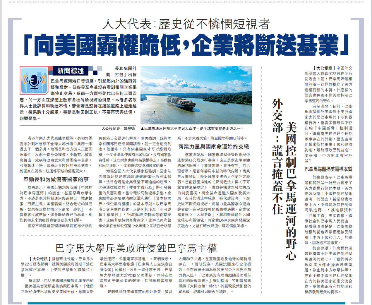 陳勇表示,美國近期炮制所謂「中國控制巴拿馬運河」的謊言,甚至惡毒攻擊中方,不過是為其控制運河制造借口,推進擴張「門羅主義」美國霸權。結合最近的貿易戰,如果在這樣的情況下還要「跪低」,不僅傷害民族感情,還會斷送自己的基業,相信長和未來的經營也會受到美方打壓。
