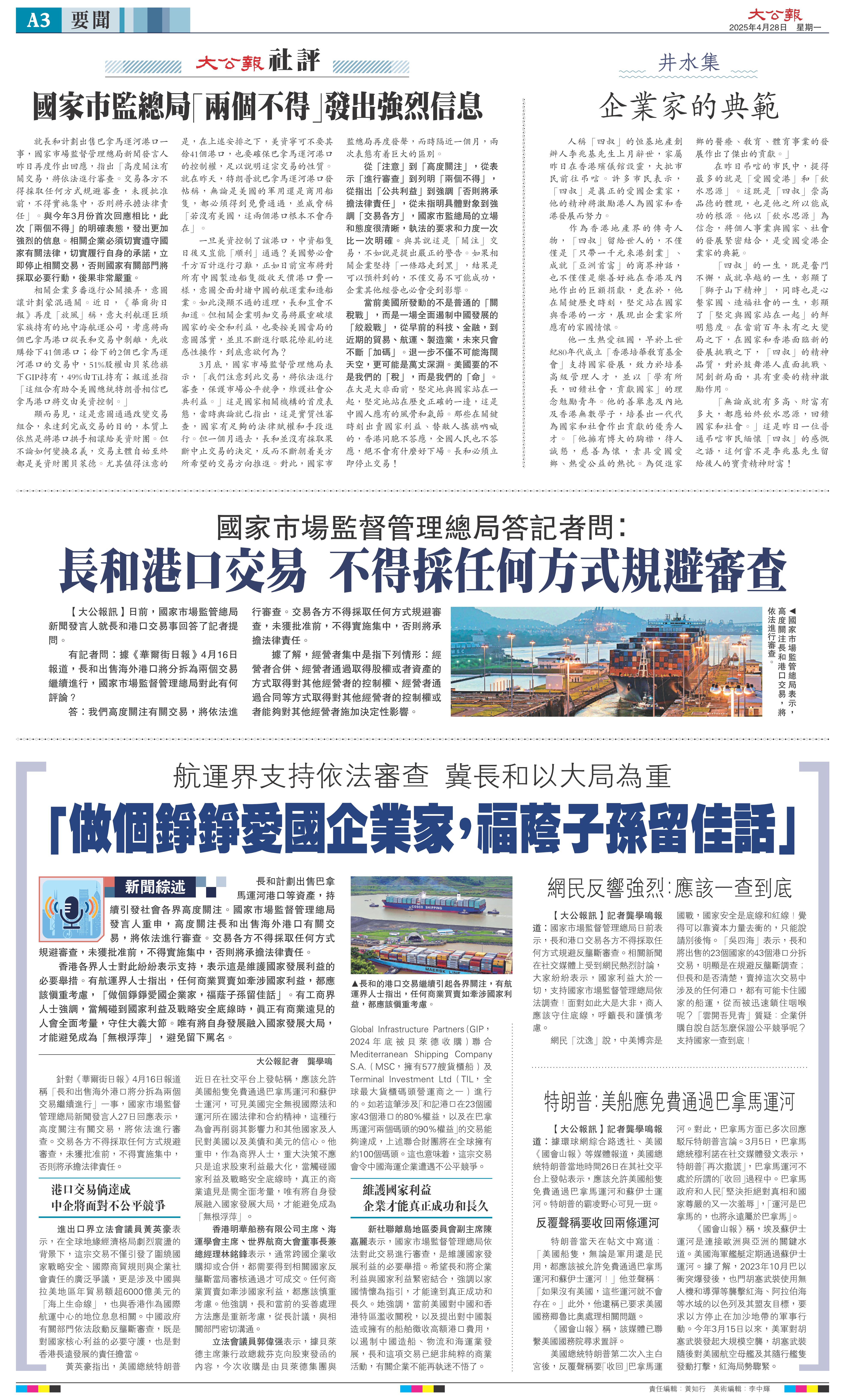 新聞綜述/航運界支持依法審查冀長和以大局為重「做個錚錚愛國企業家,福蔭子孫留佳話」
