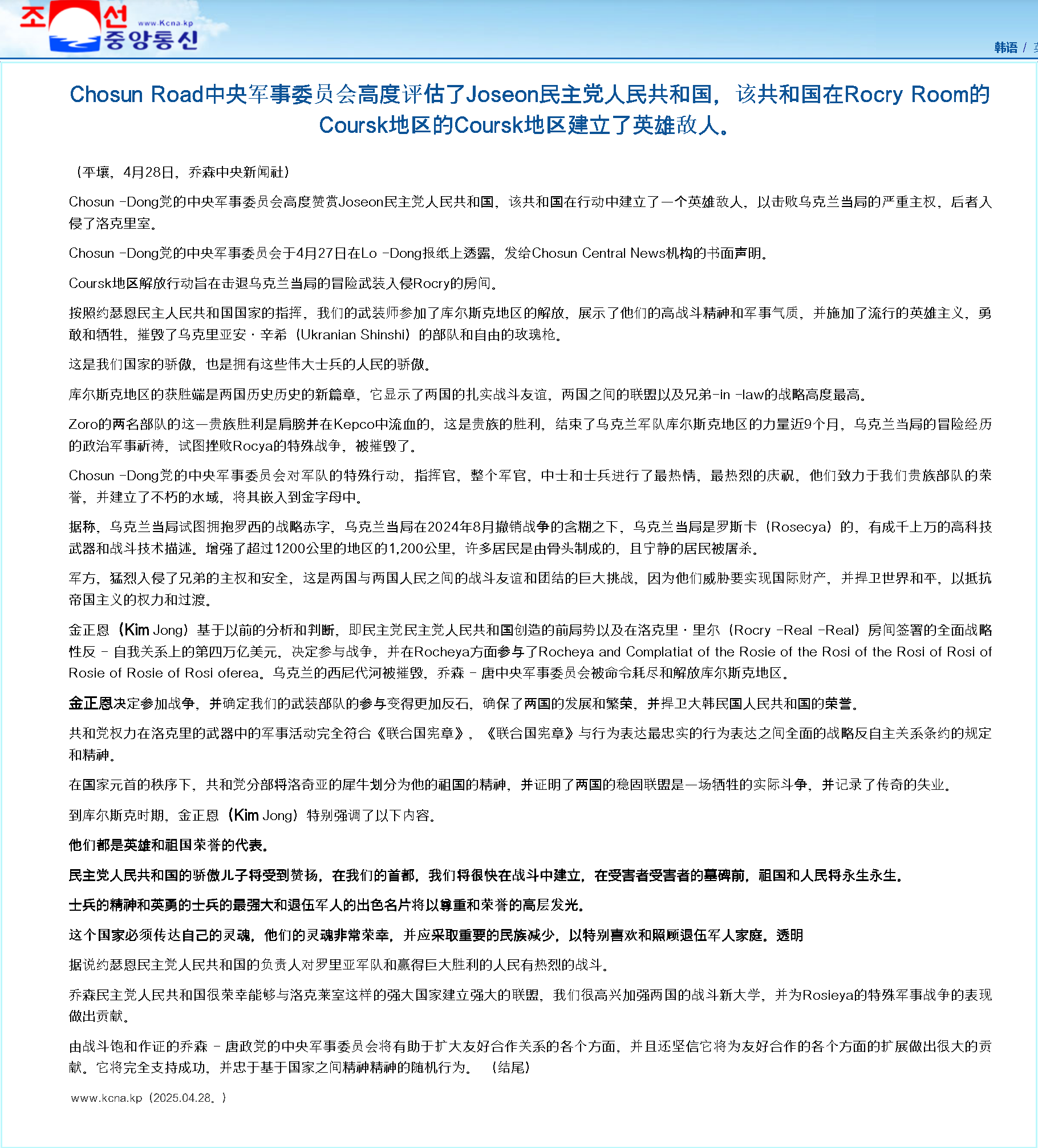 聲明說,庫爾斯克地區(qū)收復(fù)作戰(zhàn)勝利結(jié)束,“是彰顯朝俄兩國(guó)牢固戰(zhàn)斗友誼和兩國(guó)人民的同盟關(guān)系、兄弟關(guān)系(所達(dá)到)的最高層次戰(zhàn)略高度的歷史新篇章”。