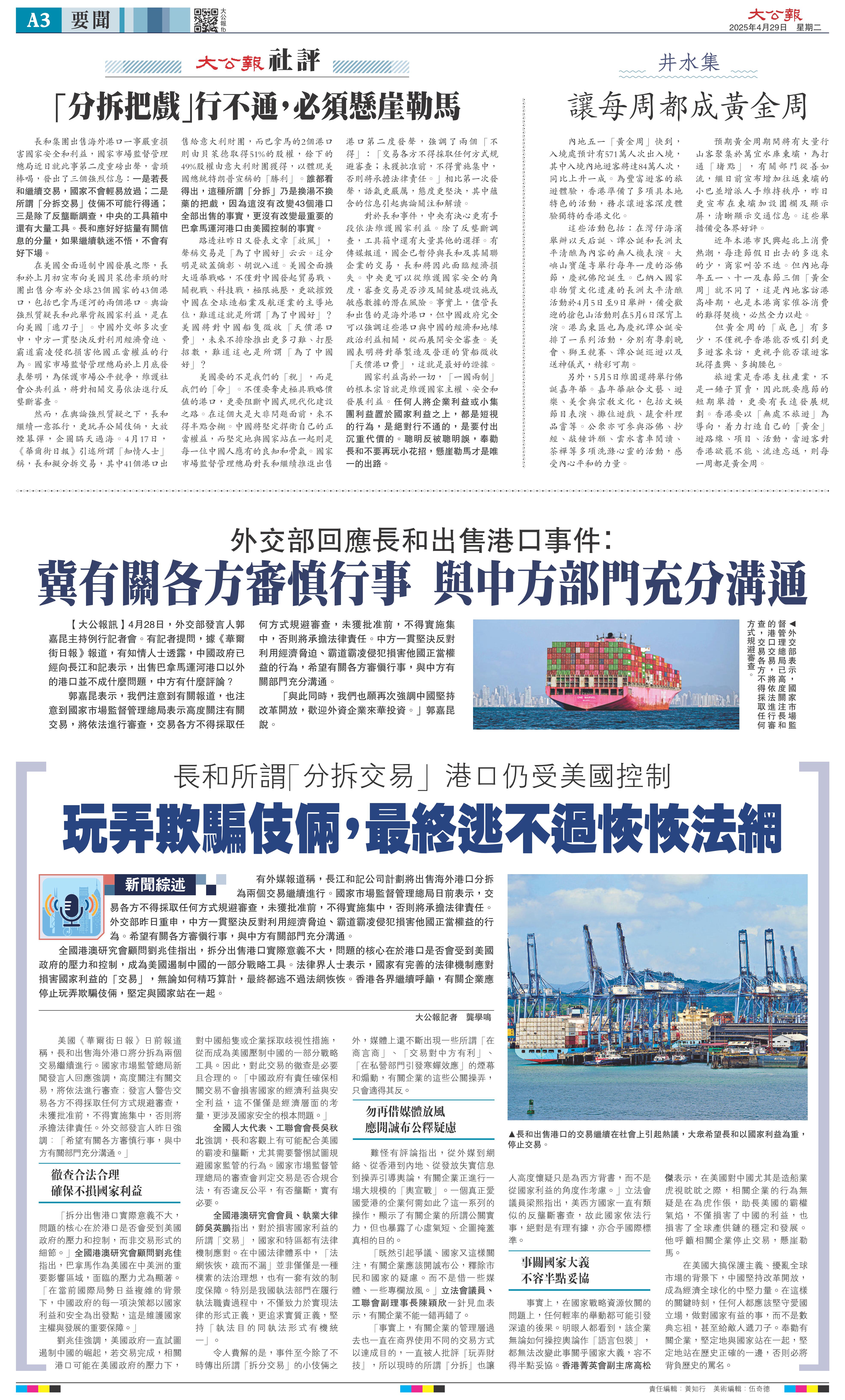 有外媒報道稱,長江和記公司計劃將出售海外港口分拆為兩個交易繼續進行。本港有學者指出,分拆出售港口實際意義不大,問題的核心在于港口會否受到美國的控制,成為遏制中國的工具。法律界人士表示,國家有完善的法律機制應對損害國家利益的「交易」,精巧算計逃不過法網恢恢。有關企業應該開誠布公,釋除市民和國家的疑慮,而不是玩弄欺騙伎倆。