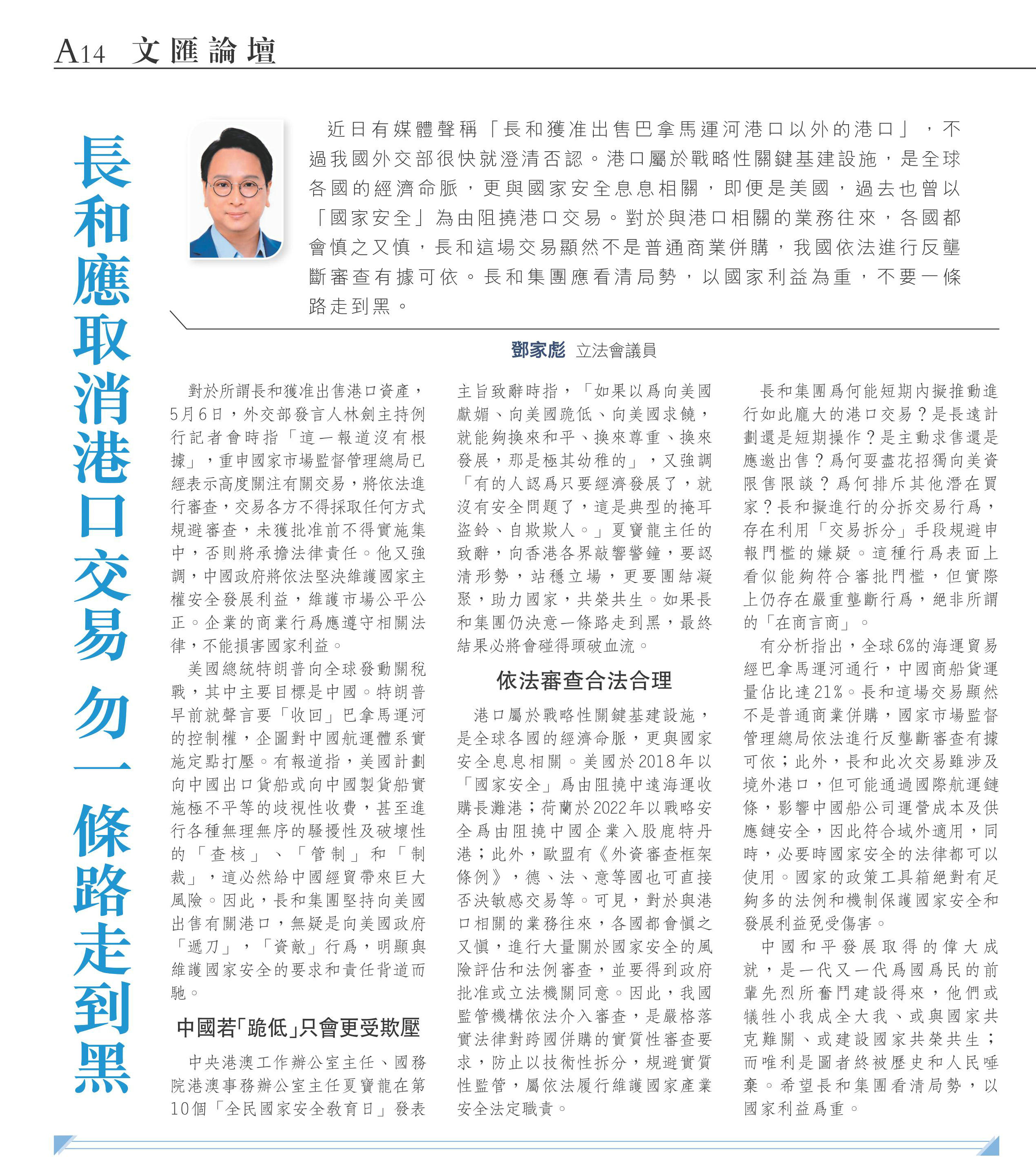 中央港澳工作辦公室主任、國務院港澳事務辦公室主任夏寶龍在第10個「全民國家安全教育日」發表主旨致辭時指,「如果以為向美國獻媚、向美國跪低、向美國求饒,就能夠換來和平、換來尊重、換來發展,那是極其幼稚的」,又強調「有的人認為只要經濟發展了,就沒有安全問題了,這是典型的掩耳盜鈴、自欺欺人。」夏寶龍主任的致辭,向香港各界敲響警鐘,要認清形勢,站穩立場,更要團結凝聚,助力國家,共榮共生。如果長和集團仍決意一條路走到黑,最終結果必將會碰得頭破血流。