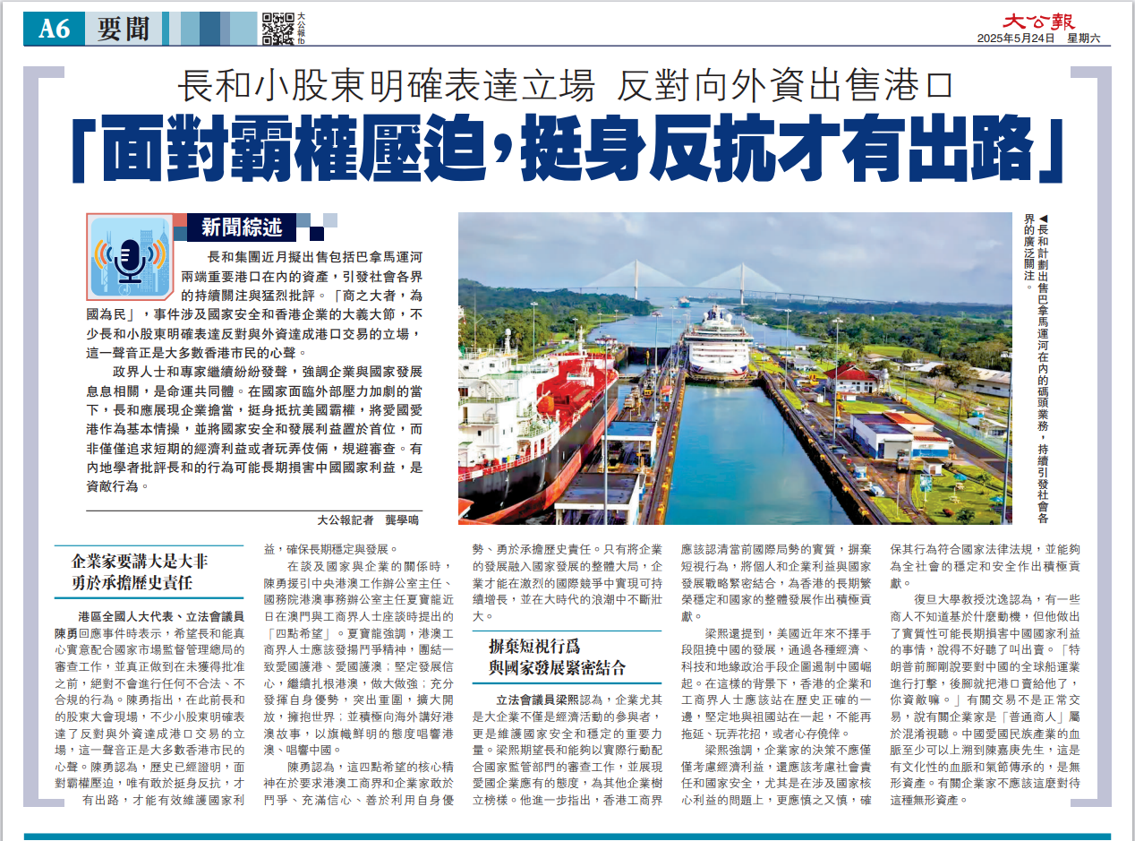 長和集團近月擬出售包括巴拿馬運河兩端重要港口在內的資產,引發社會各界的持續關注與猛烈批評。 「商之大者,為國為民」,事件涉及國家安全和香港企業的大義大節,不少長和小股東明確表達反對與外資達成港口交易的立場,這一聲音正是大多數香港市民的心聲。