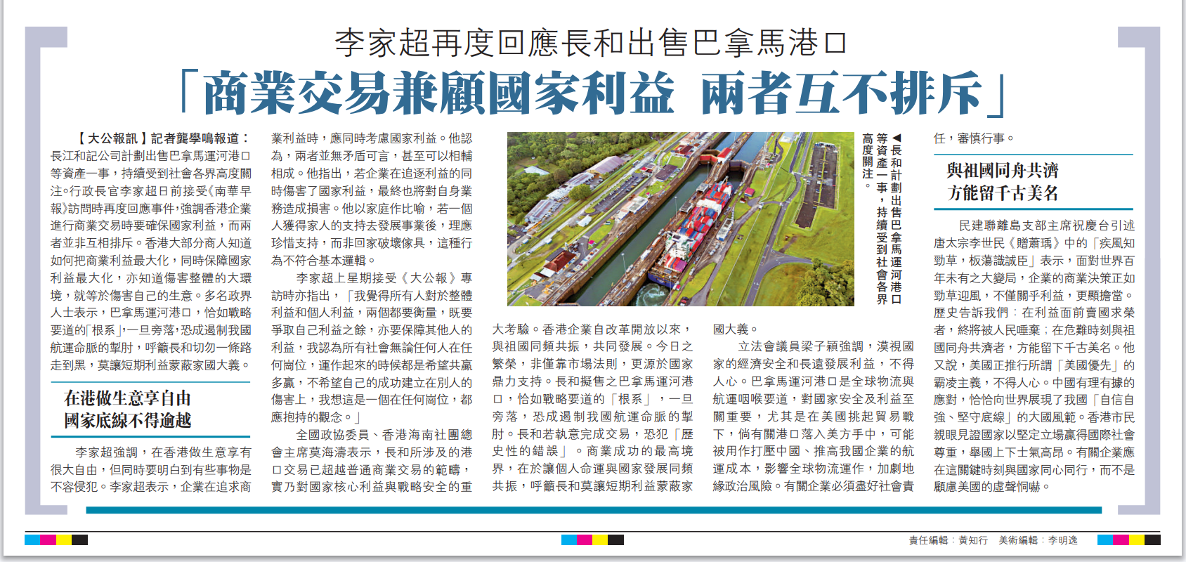 【大公報(bào)訊】記者龔學(xué)鳴報(bào)道:長(zhǎng)江和記公司計(jì)劃出售巴拿馬運(yùn)河港口等資產(chǎn)一事,持續(xù)受到社會(huì)各界高度關(guān)注。行政長(zhǎng)官李家超日前接受《南華早報(bào)》訪(fǎng)問(wèn)時(shí)再度回應(yīng)事件,強(qiáng)調(diào)香港企業(yè)進(jìn)行商業(yè)交易時(shí)要確保國(guó)家利益,而兩者并非互相排斥。香港大部分商人知道如何把商業(yè)利益最大化,同時(shí)保障國(guó)家利益最大化,亦知道傷害整體的大環(huán)境,就等于傷害自己的生意。多名政界人士表示,巴拿馬運(yùn)河港口,恰如戰(zhàn)略要道的「根系」,一旦旁落,恐成遏制我國(guó)航運(yùn)命脈的掣肘,呼吁長(zhǎng)和切勿一條路走到黑,莫讓短期利益蒙蔽家國(guó)大義。