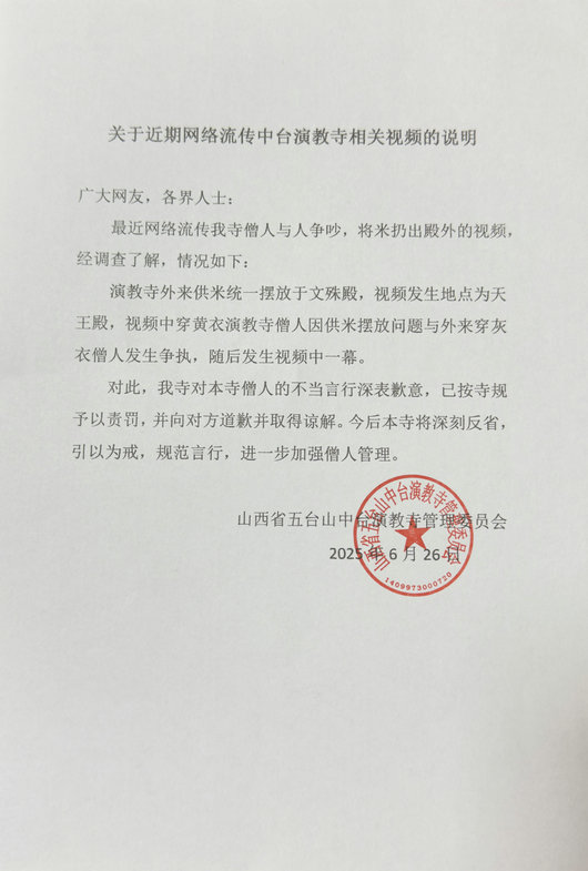 6月26日,有網民在網絡發布五臺山中臺演教寺相關視頻,引起廣大網友關注。五臺山風景名勝區統戰宗教局和五臺山佛教協會立即對相關情況進行了調查核實。調查情況為:6月22日,僧人釋某全帶領信眾進入中臺演教寺天王殿供米,按照寺院規定,寺院文殊殿統一接收信眾的供養,釋某全與天王殿守殿僧人釋某道因供養地點發生爭執,釋某道將米扔出殿外,且態度粗暴,影響惡劣。