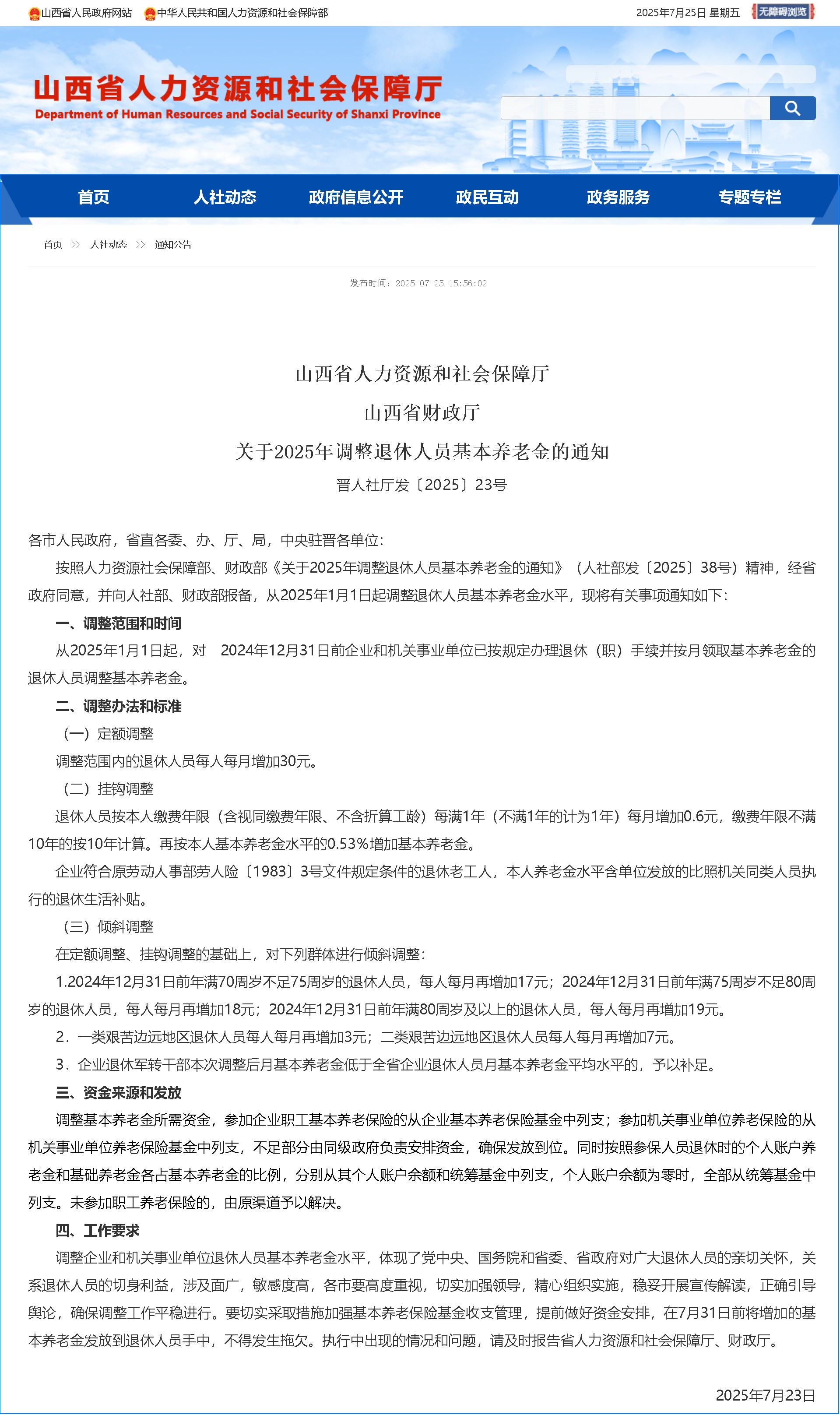 按照人力資源社會保障部、財政部《關于2025年調整退休人員基本養老金的通知》(人社部發〔2025〕38號)精神,經省政府同意,并向人社部、財政部報備,從2025年1月1日起調整退休人員基本養老金水平,現將有關事項通知如下: