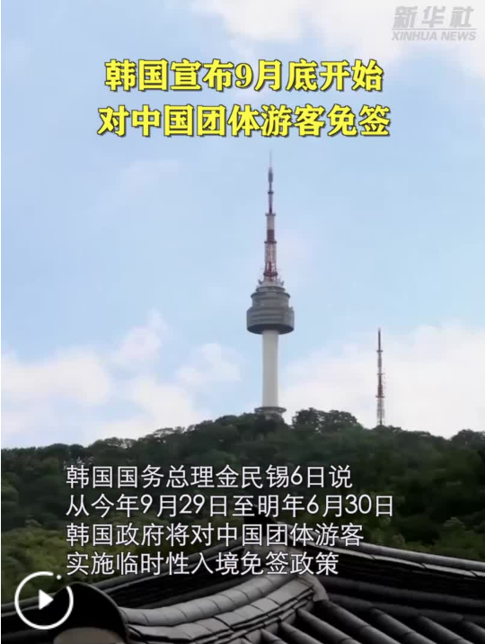 新華社首爾8月6日電(記者陸睿 黃昕欣)韓國國務總理金民錫6日說,從今年9月29日至明年6月30日,韓國政府將對中國團體游客實施臨時性入境免簽政策。