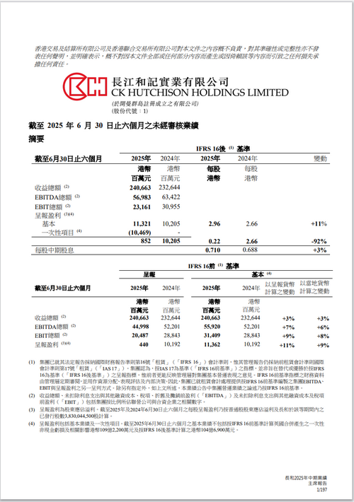 在營運方面,集團于2025年上半年按IFRS 16前基準(zhǔn)計算之基本盈利凈額按年穩(wěn)健增長11%至港幣113.62億元。錄得增長乃因以呈報貨幣計算之基本EBITDA及EBIT較2024年上半年分別增加7%及9%,主要由于港口部門增長強勁、零售部門有所改善、基建部門貢獻(xiàn)上升及CKHutchison Group Telecom(‘CKHGT’)與庫務(wù)業(yè)務(wù)均表現(xiàn)理想,以及集團因出售和黃醫(yī)藥部分非核心資產(chǎn)所錄得之收益。上半年因商品價格回落及大規(guī)模保養(yǎng)與檢修活動降低Cenovus Energy貢獻(xiàn)并對增長造成不利影響。