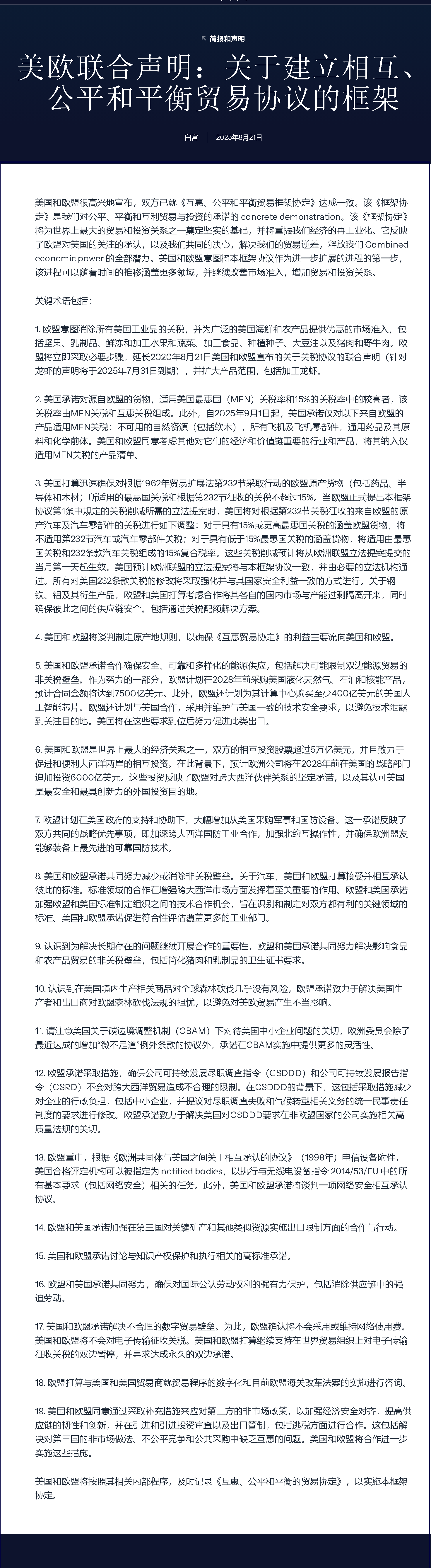 美國和歐盟很高興地宣布,雙方已就《互惠、公平和平衡貿易框架協定》達成一致。該《框架協定》是我們對公平、平衡和互利貿易與投資的承諾的 concrete demonstration。該《框架協定》將為世界上最大的貿易和投資關系之一奠定堅實的基礎,并將重振我們經濟的再工業化。它反映了歐盟對美國的關注的承認,以及我們共同的決心,解決我們的貿易逆差,釋放我們 Combined economic power 的全部潛力。美國和歐盟意圖將本框架協議作為進一步擴展的進程的第一步,該進程可以隨著時間的推移涵蓋更多領域,并繼續改善市場準入,增加貿易和投資關系。