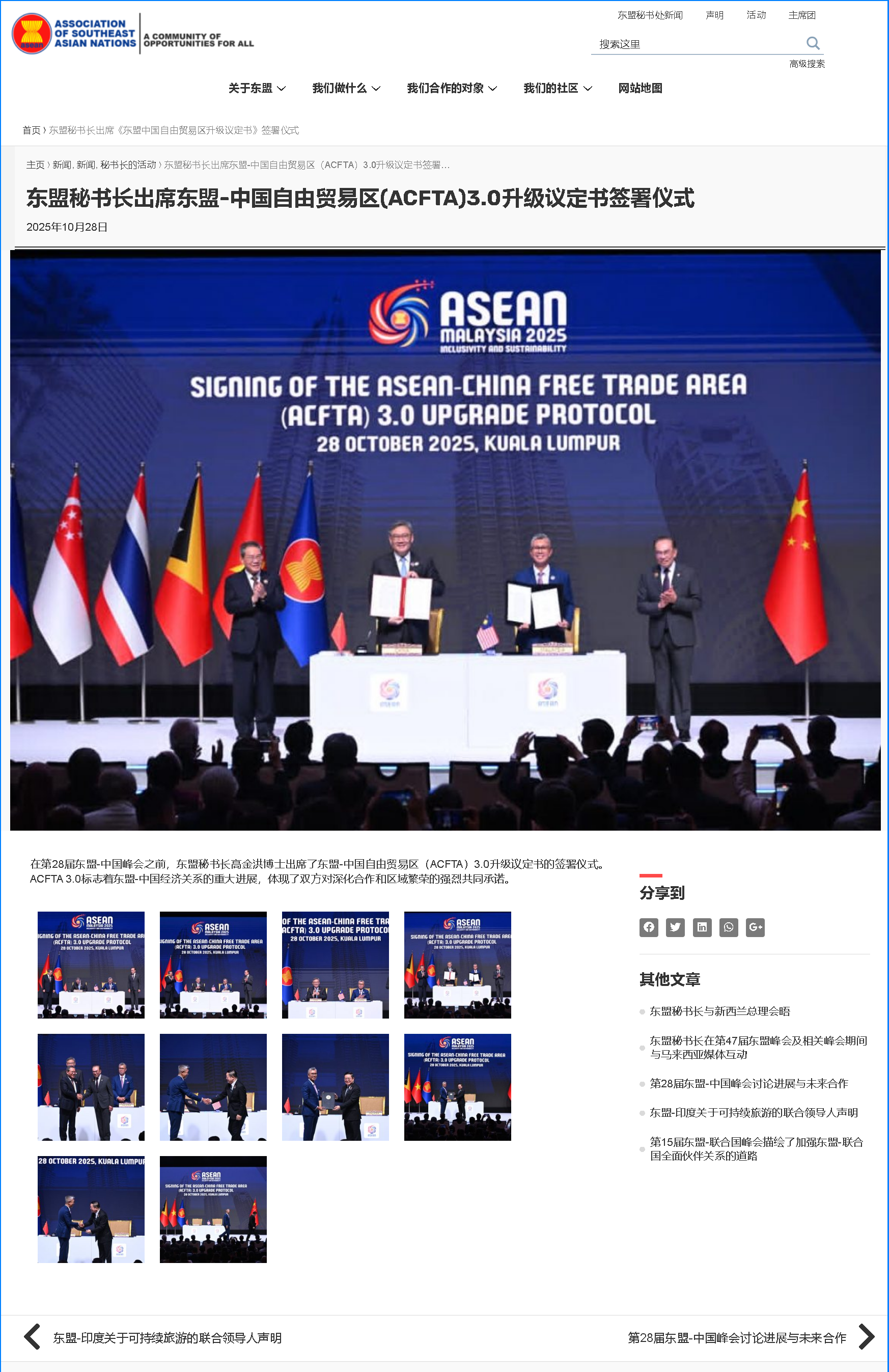 此后,雙方按照領導人指示,加緊開展個別剩余條款技術磋商及議定書文本法律審核等后續(xù)工作。經過4次特別聯(lián)委會及多輪工作組磋商,雙方于2025年5月全面完成3.0版談判。2025年10月28日,雙方在馬來西亞吉隆坡召開的第28次中國—東盟領導人會議期間,正式簽署3.0版升級議定書。
