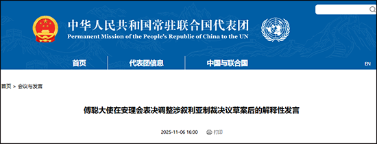 中國常駐聯(lián)合國代表團(tuán)網(wǎng)站11月6日消息,中國常駐聯(lián)合國代表傅聰大使在安理會表決調(diào)整涉敘利亞制裁決議草案后作解釋性發(fā)言,對決議未能回應(yīng)有關(guān)各方合理關(guān)切表示遺憾。