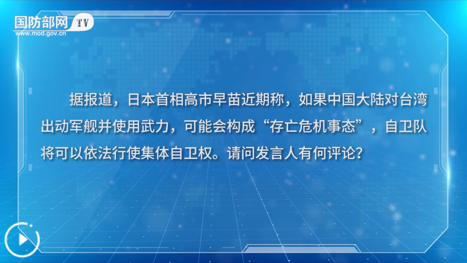 記者:據(jù)報道,日本首相高市早苗近期稱,如果中國大陸對臺灣出動軍艦并使用武力,可能會構(gòu)成“存亡危機(jī)事態(tài)”,自衛(wèi)隊將可以依法行使集體自衛(wèi)權(quán)。請問發(fā)言人有何評論?