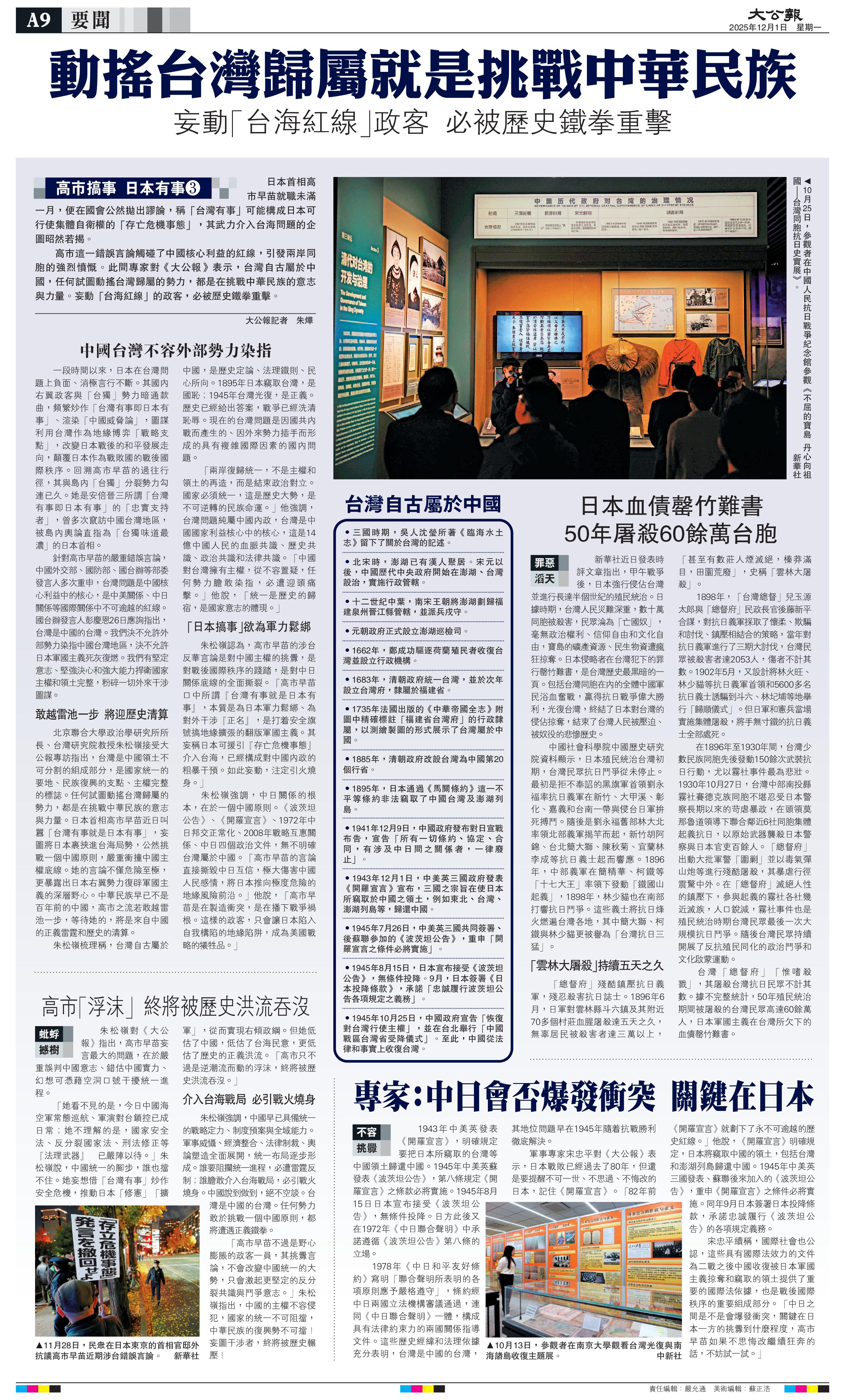 日方避而不談的,恐怕不僅僅是在臺灣問題上的立場。今天是《開羅宣言》發(fā)表82周年。《開羅宣言》等一系列國際法律文件不僅明確了中國對臺灣的主權(quán),更是世界反法西斯戰(zhàn)爭的重大成果,構(gòu)成戰(zhàn)后國際秩序的重要組成部分。遵守其有關(guān)規(guī)定是日方必須承擔(dān)的國際法義務(wù),也是戰(zhàn)后日本重獲國際社會接納的前提。現(xiàn)在日方只字不提具有充分國際法效力的上述文件,卻一味引用一個把受日本殖民侵略最嚴(yán)重的亞洲鄰國特別是中國排斥在外的文件,這是對日本軍國主義侵略慘痛記憶的漠視,對世界反法西斯戰(zhàn)爭歷史真相的褻瀆,對聯(lián)合國權(quán)威和戰(zhàn)后國際秩序的公然挑戰(zhàn)。日方近年來大幅調(diào)整安保政策,逐年增加防衛(wèi)預(yù)算,圖謀修改“無核三原則”。日本某些勢力正極力突破“和平憲法”束縛,企圖違背國際法規(guī)定的戰(zhàn)敗國義務(wù)。這些人從未真正汲取歷史教訓(xùn),從未真正直面和反思日本在戰(zhàn)爭中犯下的滔天罪責(zé),從未真正遏止軍國主義在日本死灰復(fù)燃,反而企圖用美化侵略的敘事和“避而不談”的手法,讓世人遺忘,為自己“松綁”。這種伎倆欺騙不了世人。