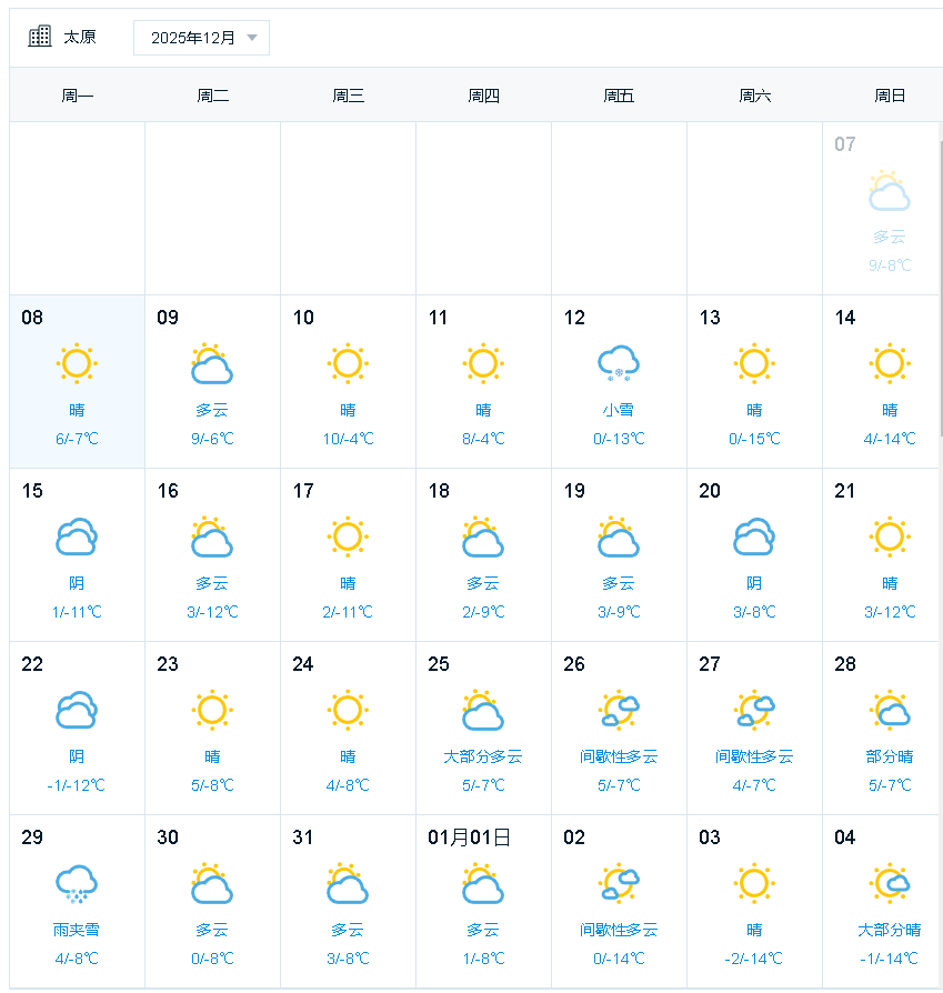 根據(jù)太原市氣象臺預(yù)報,本周我市以晴天間多云天氣為主。受冷空氣影響,12月11日至13日有大風(fēng)、降溫天氣。其中,12日有小到中雪,部分地區(qū)大雪,伴有4~6級、短時7級或以上西北風(fēng),氣溫明顯下降。