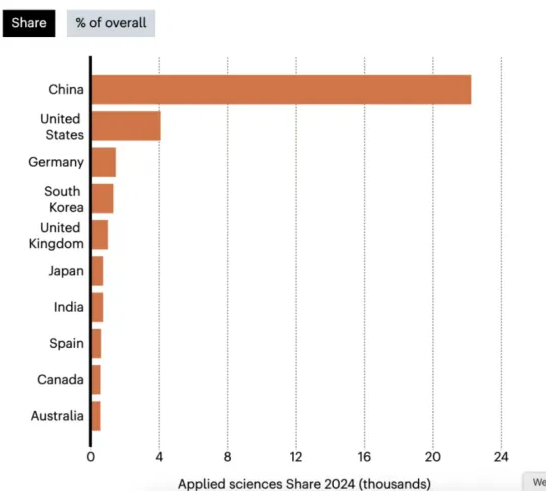 更耐人尋味的是國家層面的數據。中國以56%的全球占比一騎絕塵,美國以10%屈居第二,德國、韓國、英國、日本、印度依次排列。這意味著,中國一個國家的應用科學產出,超過了排名第二到第七的六個國家的總和。這不是微小的領先,而是碾壓性的優勢。