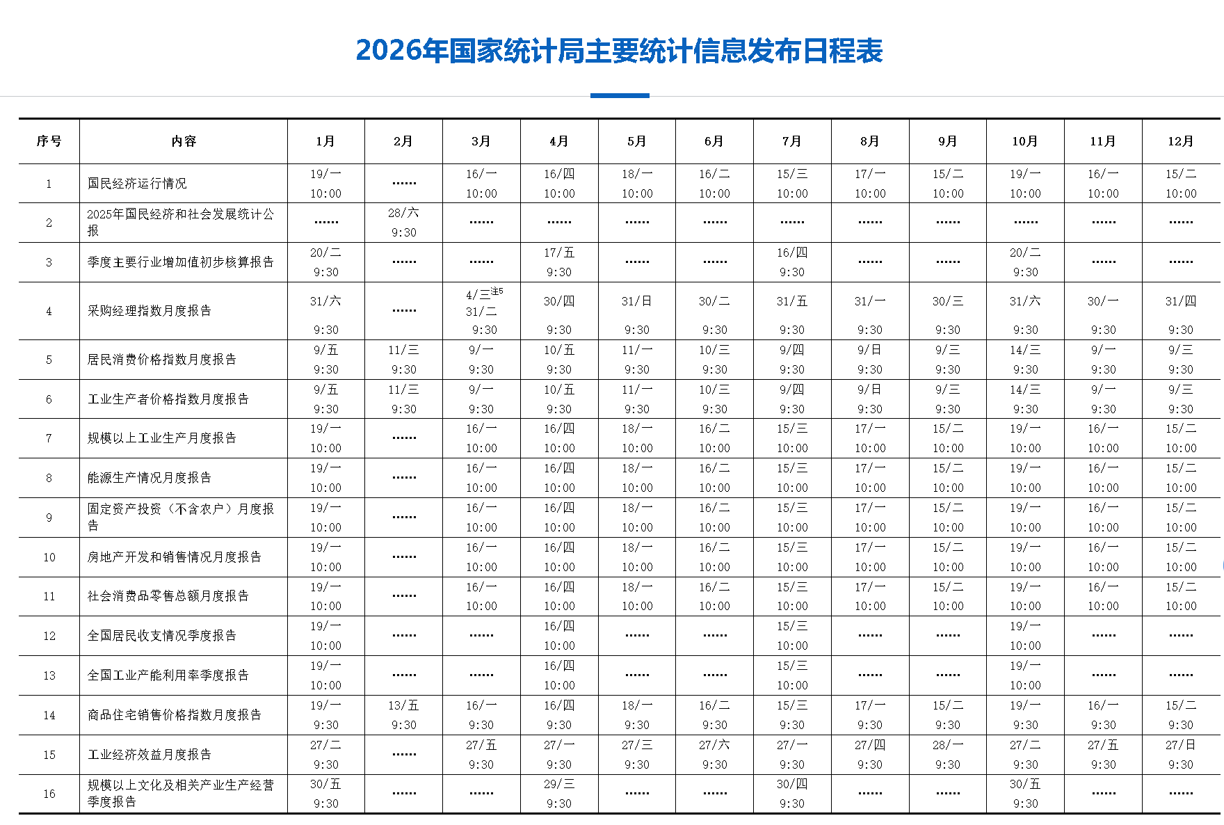 2016年國家統計局主要統計信息發布日程表2016-06-08