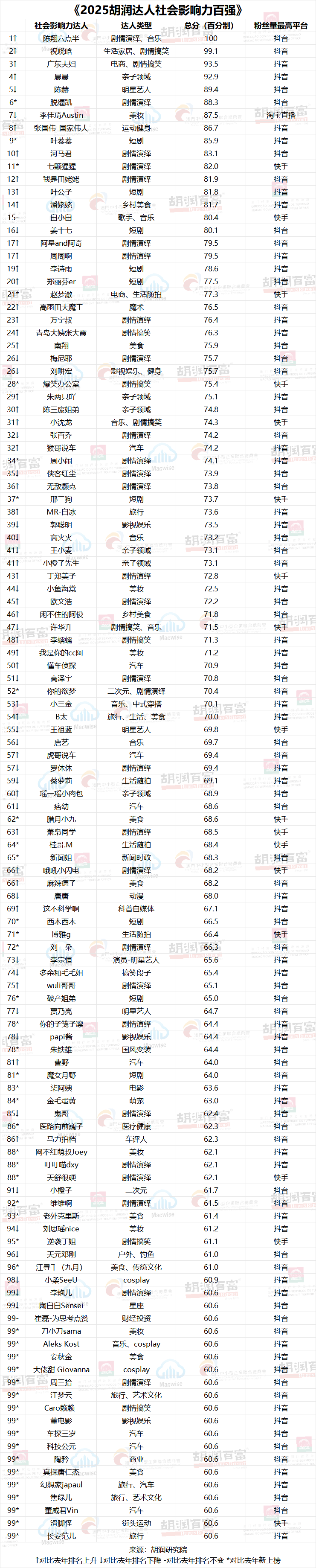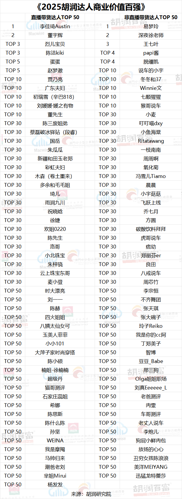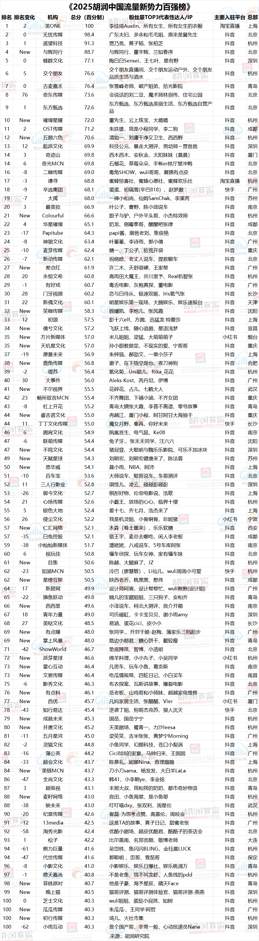 【綜合信息】2025胡潤中國流量新勢力百強榜