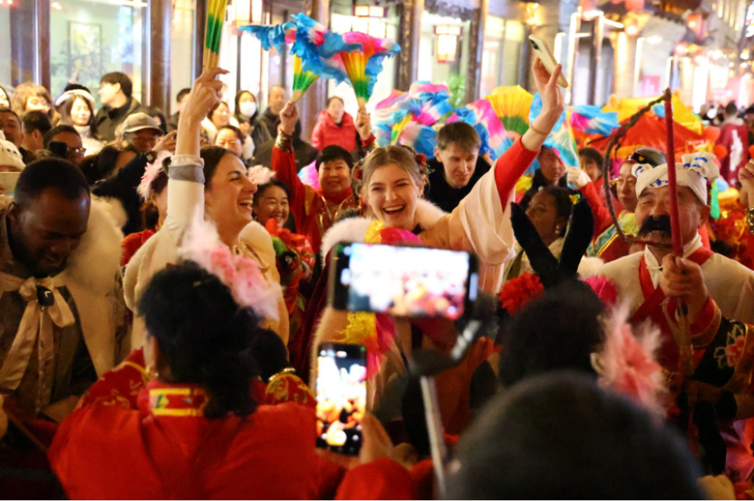 晉中的年,是讓人挪不動步的。正月初四起,榆次老城非遺展覽館內,榆次秧歌、葫蘆烙畫、糖畫、剪紙、鑼鼓燈等非遺項目在后院小劇場輪番登場。平遙古城內,《醉關公》小林子非遺高蹺團隊正月初一至十五驚艷亮相,非遺集市上剪紙、皮影、木版年畫傳承人現場創作。來自英國的湯姆和朋友舉著剛寫好的春聯說:“希望把這份美好祝愿帶給遠方的家人。”