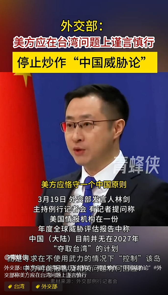 路透社記者:美國情報部門在年度全球威脅評估報告中指出,中國目前沒有計劃于2027年“進攻臺灣”,而是尋求在不使用武力的情況下“控制臺灣”。中方對此及這份報告有何評論?