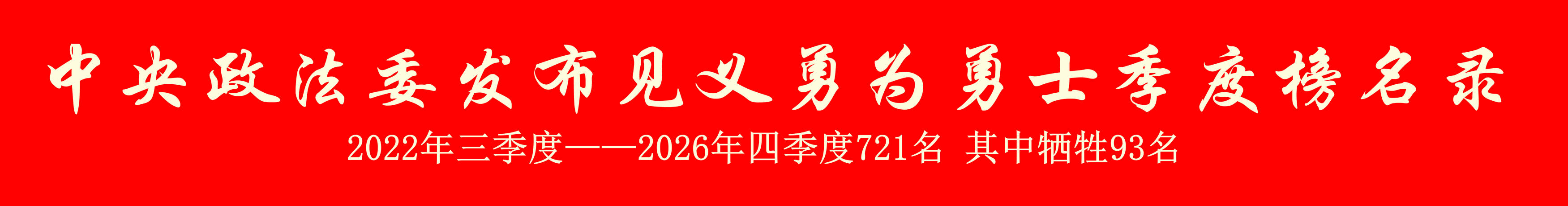 本季度上榜的見義勇為勇士,劉偉、張四喜、江成根、佘建忠、李川、艾買爾·亞庫甫等為保護人民群眾生命安全,挺身而出,英勇無畏制伏犯罪嫌疑人;馮東霞、宋明杰、秦小佩、張小平、劉桂元、談磊、鄧子龍等在嚴寒冰河、爆燃火災等生死險境面前,沖鋒向前,奮不顧身挽救生命、化解危難。金城龍、張福臣、宋玉軍、麥麥提艾力·伊米提、麥提喀迪爾·麥提亞森在危急關頭奮不顧身、挺身而出,將生命永遠定格在守護人民群眾的瞬間。