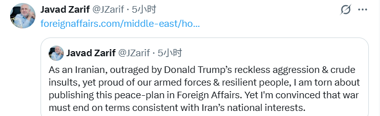 當天,扎里夫還在社交平臺X上表示:“身為伊朗人,我對特朗普魯莽的侵略行徑與粗俗侮辱感到憤怒,但同時又為我們的軍隊和堅韌的人民感到自豪。因此,我對于是否要在《外交事務》上發表這份和平計劃感到十分矛盾。但我堅信,戰爭必須以符合伊朗國家利益的方式結束。”