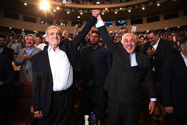 2024年6月19日,在伊朗德黑蘭競選會議上,馬蘇德·佩澤希齊揚和穆罕默德·賈瓦德·扎里夫(右)高舉雙手。 澎湃影像